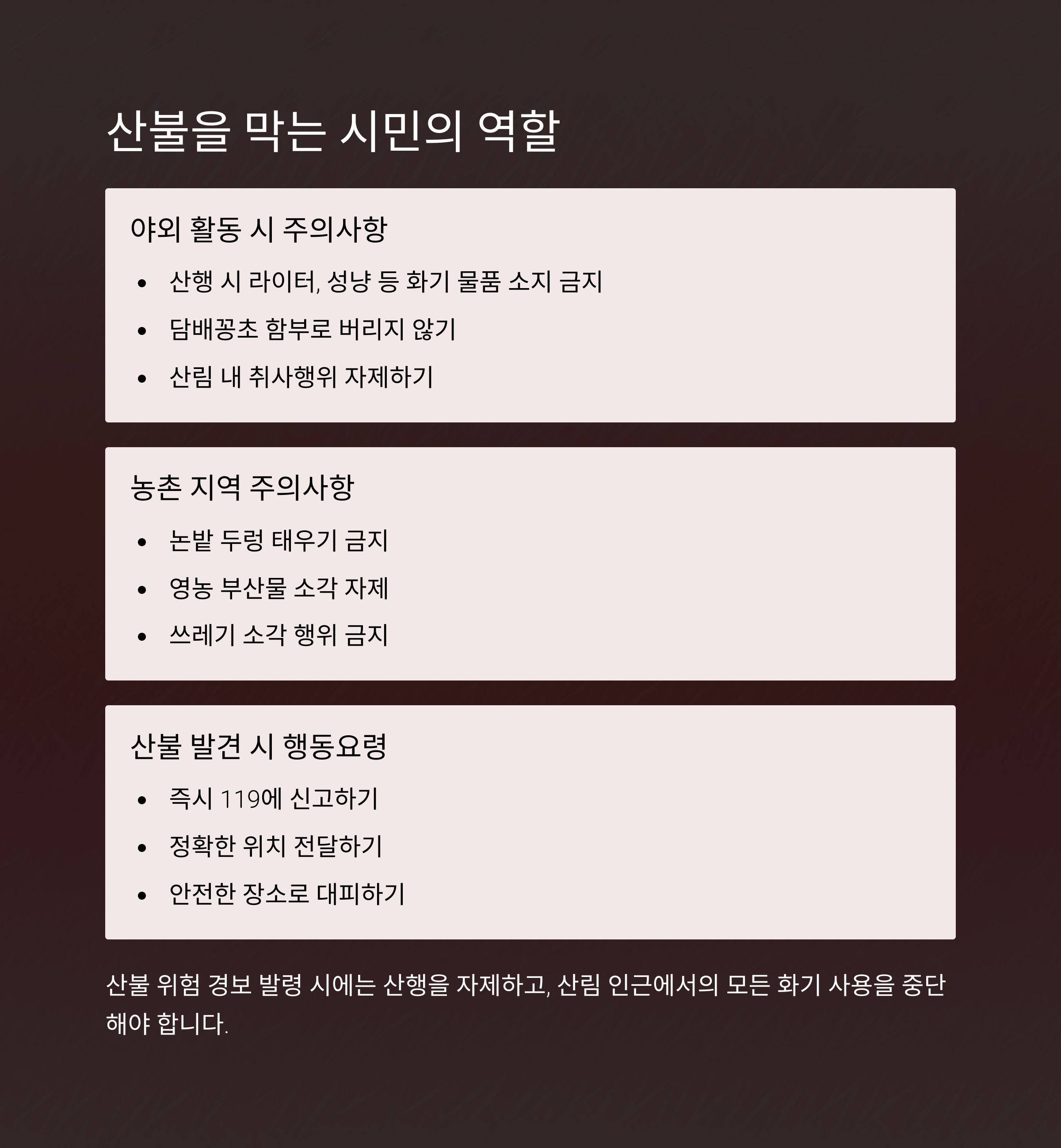 산림 지역에서 불 사용을 자제하고, 성묘나 쓰레기 소각 시 안전수칙을 반드시 지켜야 합니다.