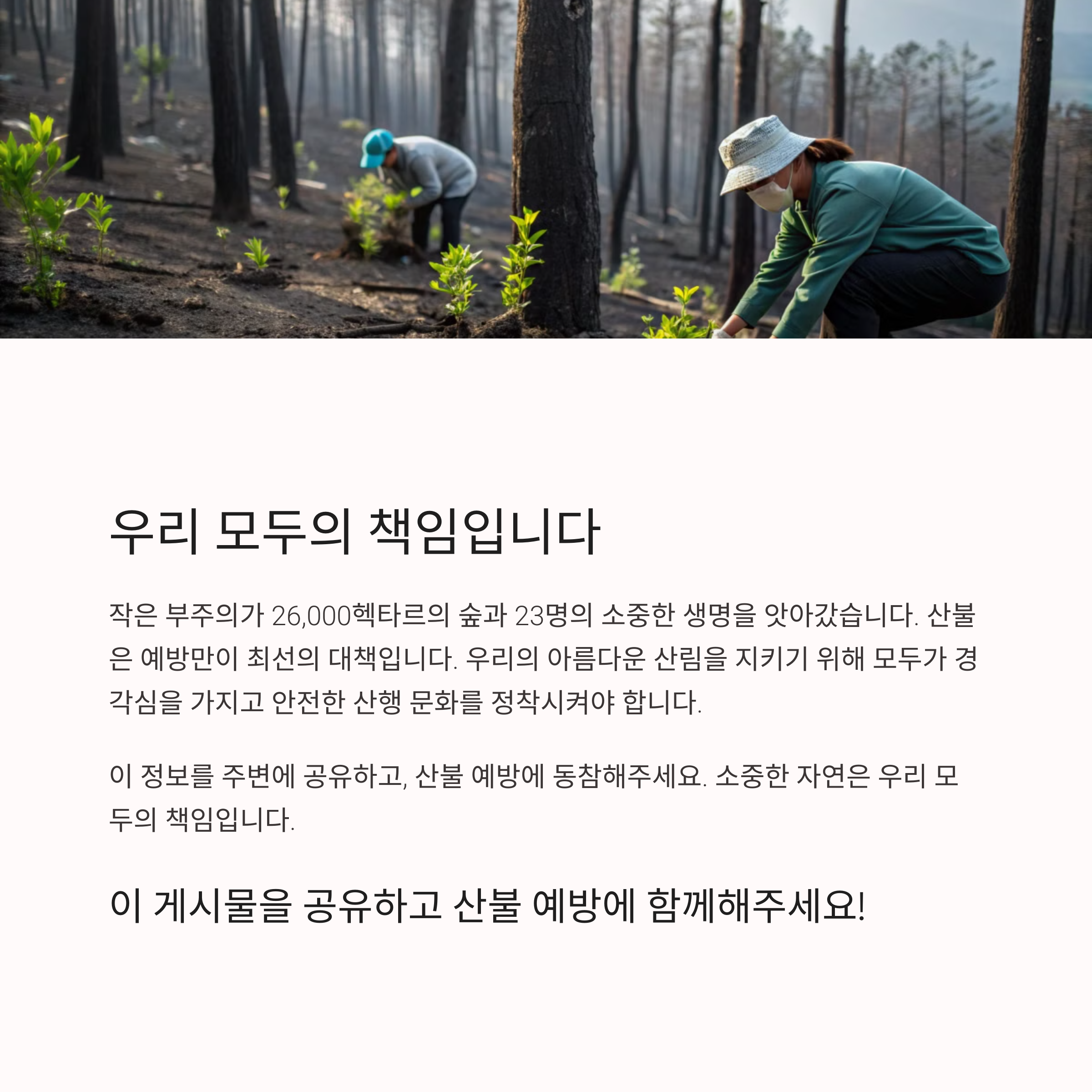 여러분은 산불 예방을 위해 어떤 노력을 하고 계신가요? 혹시 유사한 경험이 있으셨나요? 댓글을 통해 소중한 의견을 공유해 주세요. 함께 나누는 이야기가 또 다른 예방으로 이어질 수 있습니다.