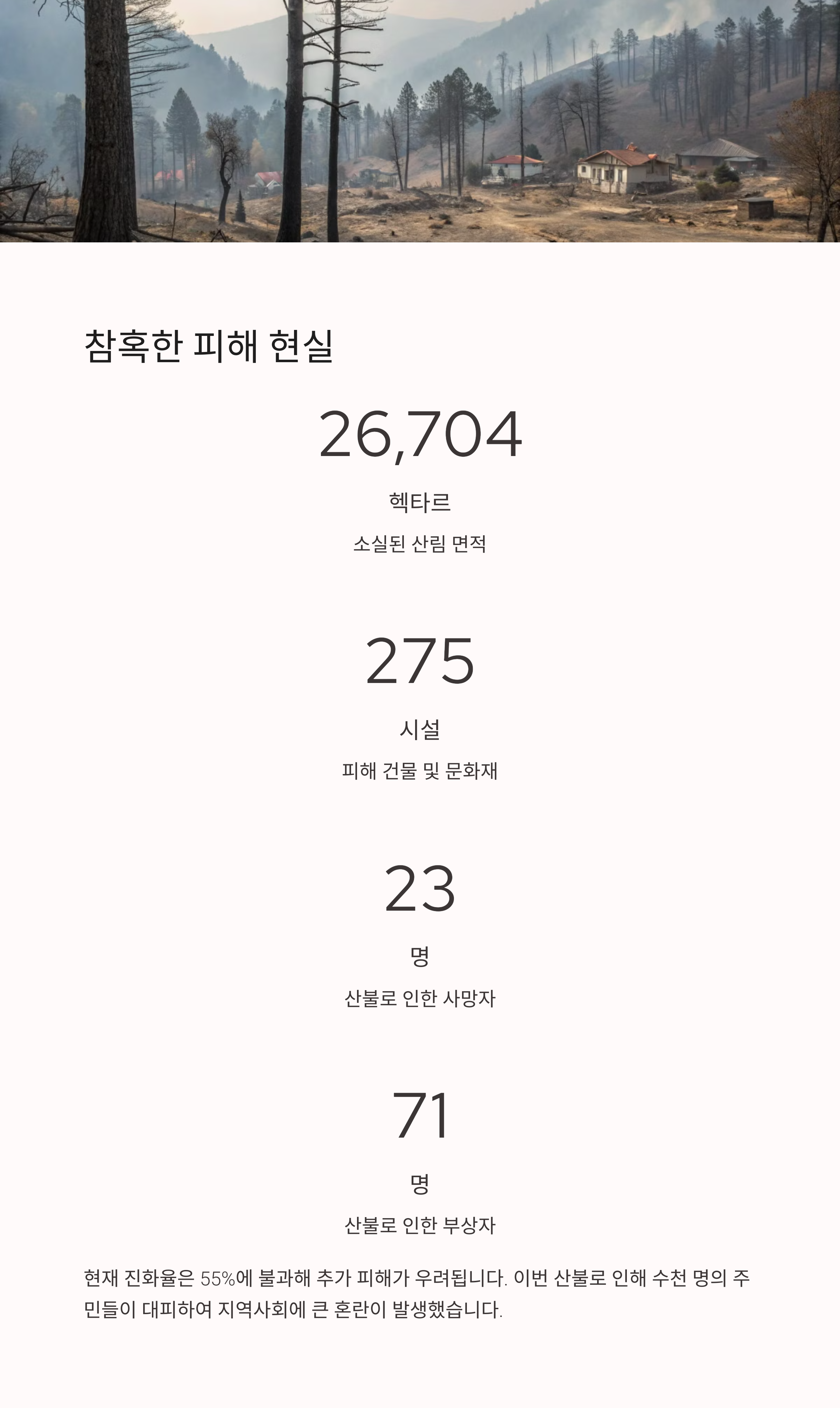 2025년 3월 기준으로 이번 산불은 26,704헥타르의 면적을 태우고, 23명의 생명을 앗아갔으며, 수많은 주택과 창고가 불에 탔습니다. 현재까지도 진화율은 55%에 불과하며, 인력과 장비가 부족한 현실이 계속되고 있습니다. 정부와 지자체는 산불 예방과 초기 진화 시스템 개선, 그리고 기후 변화에 대응하는 정책을 마련해야 할 것입니다.