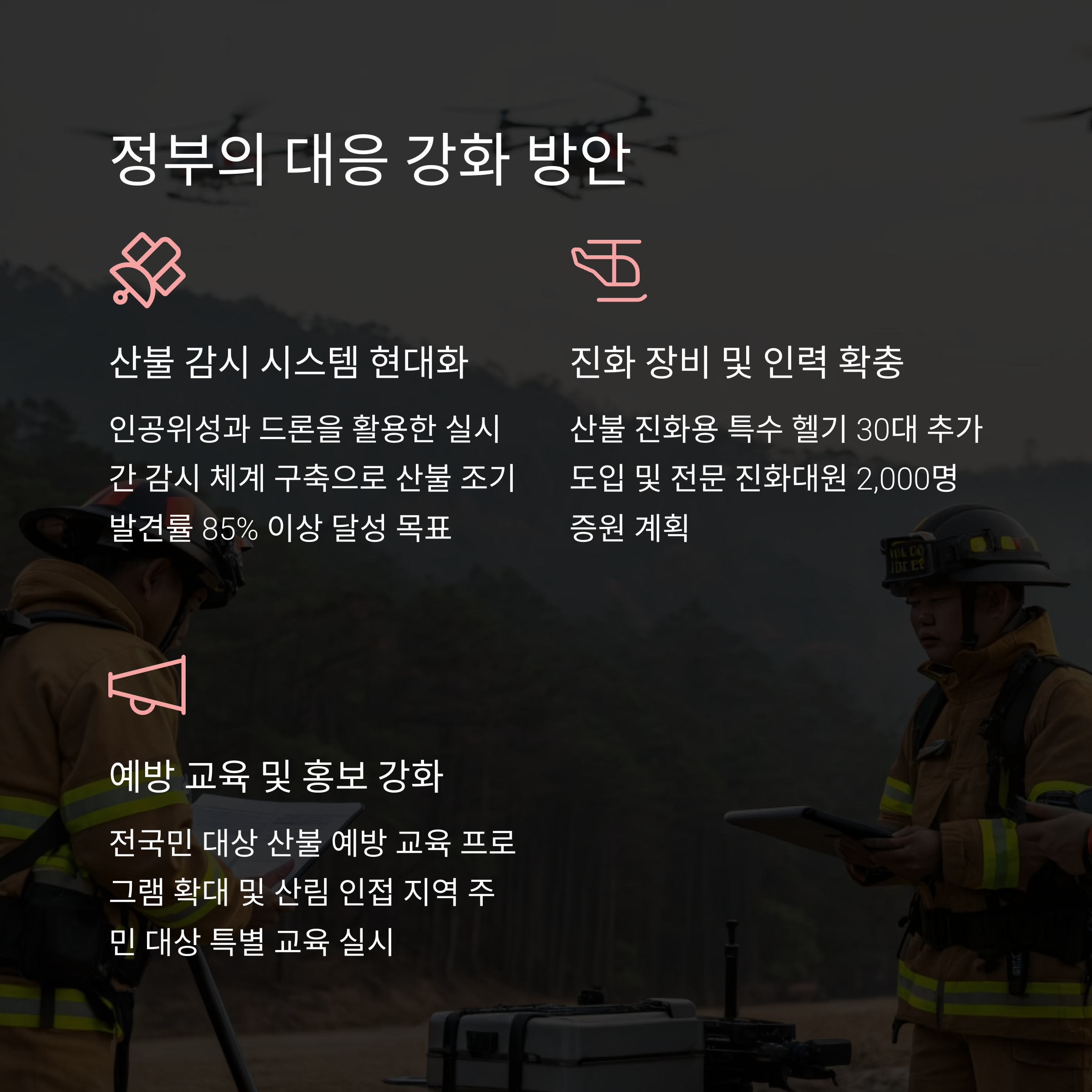 | 경각심 부족으로 인한 부주의 확산 | 진화 인력 부족, 헬기 접근 곤란 | 정부·지자체 협력 및 주민 교육 확대 |