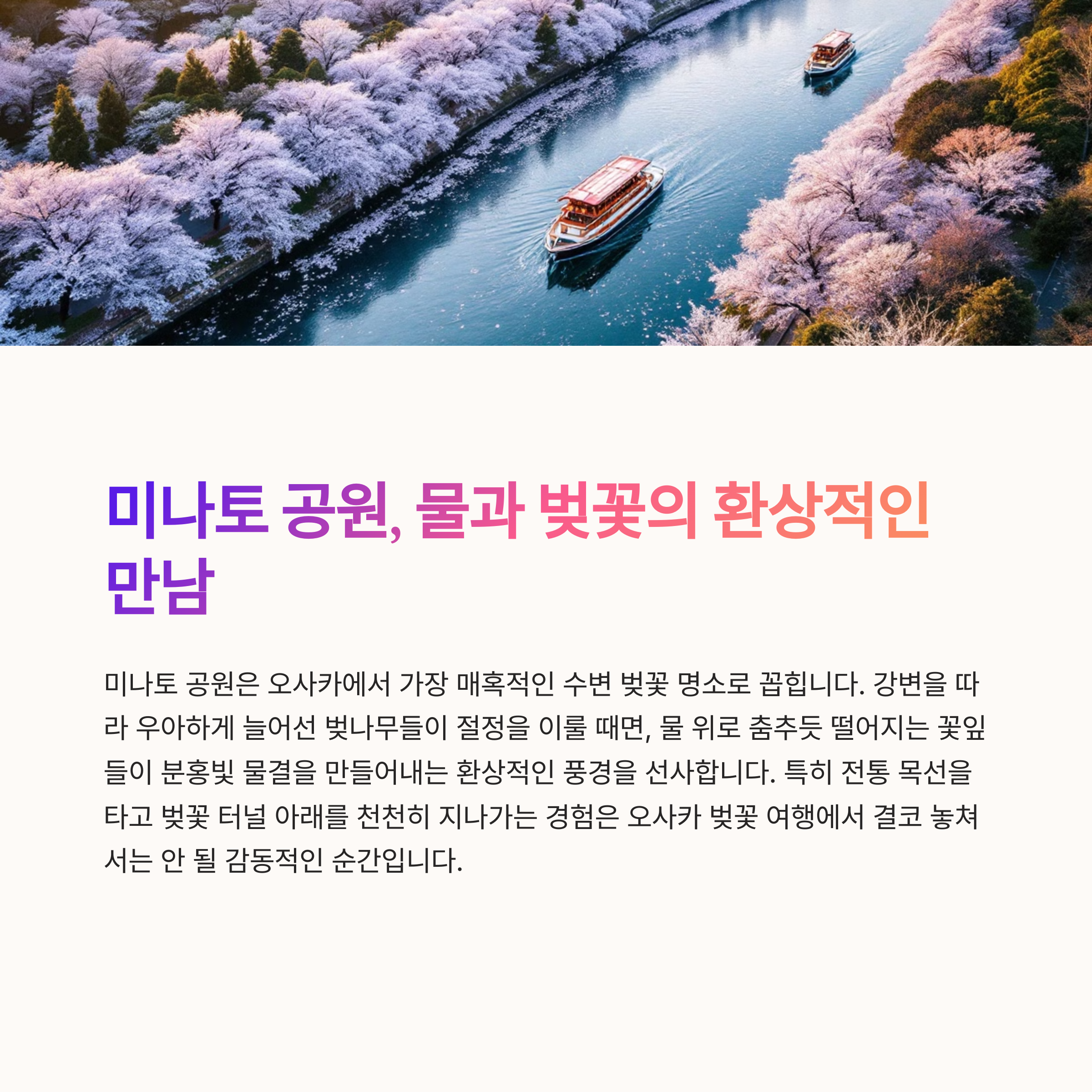 오사카는 벚꽃과 함께하는 여행으로 일본의 봄을 가장 아름답게 체험할 수 있는 도시입니다. 각기 다른 매력을 지닌 7곳의 벚꽃 명소는 여행자에게 감동과 휴식을 동시에 제공합니다. 특히, 오사카 성 공원과 사쿠라노미야 공원처럼 대중적으로 알려진 곳부터, 조용히 자연을 느낄 수 있는 오이세키 공원까지, 다양한 선택지를 통해 나만의 벚꽃 여행을 설계해보세요. 바쁜 일상 속에서 잠시 벗어나 자연과 문화가 어우러진 오사카의 봄을 만끽해보는 시간은 분명 값진 추억으로 남을 것입니다.