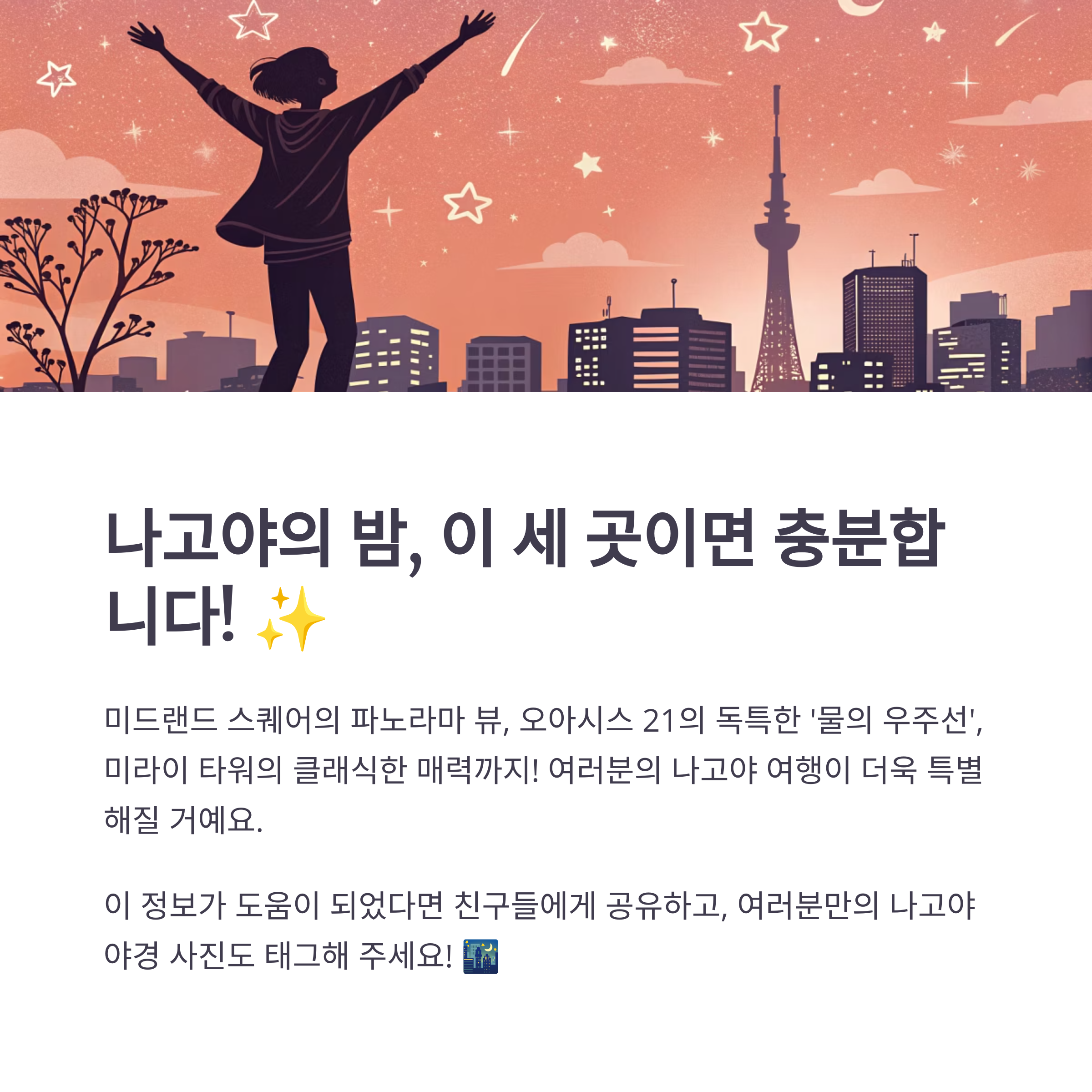 오늘은 나고야의 밤을 더욱 빛내줄 야경 스팟 세 곳을 소개해 드렸어요. 사실 여행 가면 낮에는 관광지 구경하느라 바쁘고, 밤에는 숙소에서 쉬거나 밥 먹고 끝나는 경우가 많은데, 이렇게 멋진 야경을 보고 나면 하루의 피로가 싹 가시는 느낌이 들더라고요! 여러분의 나고야 여행에 조금이나마 도움이 되었으면 좋겠습니다. 더 궁금한 점이 있다면 댓글로 물어봐 주세요~ 😊