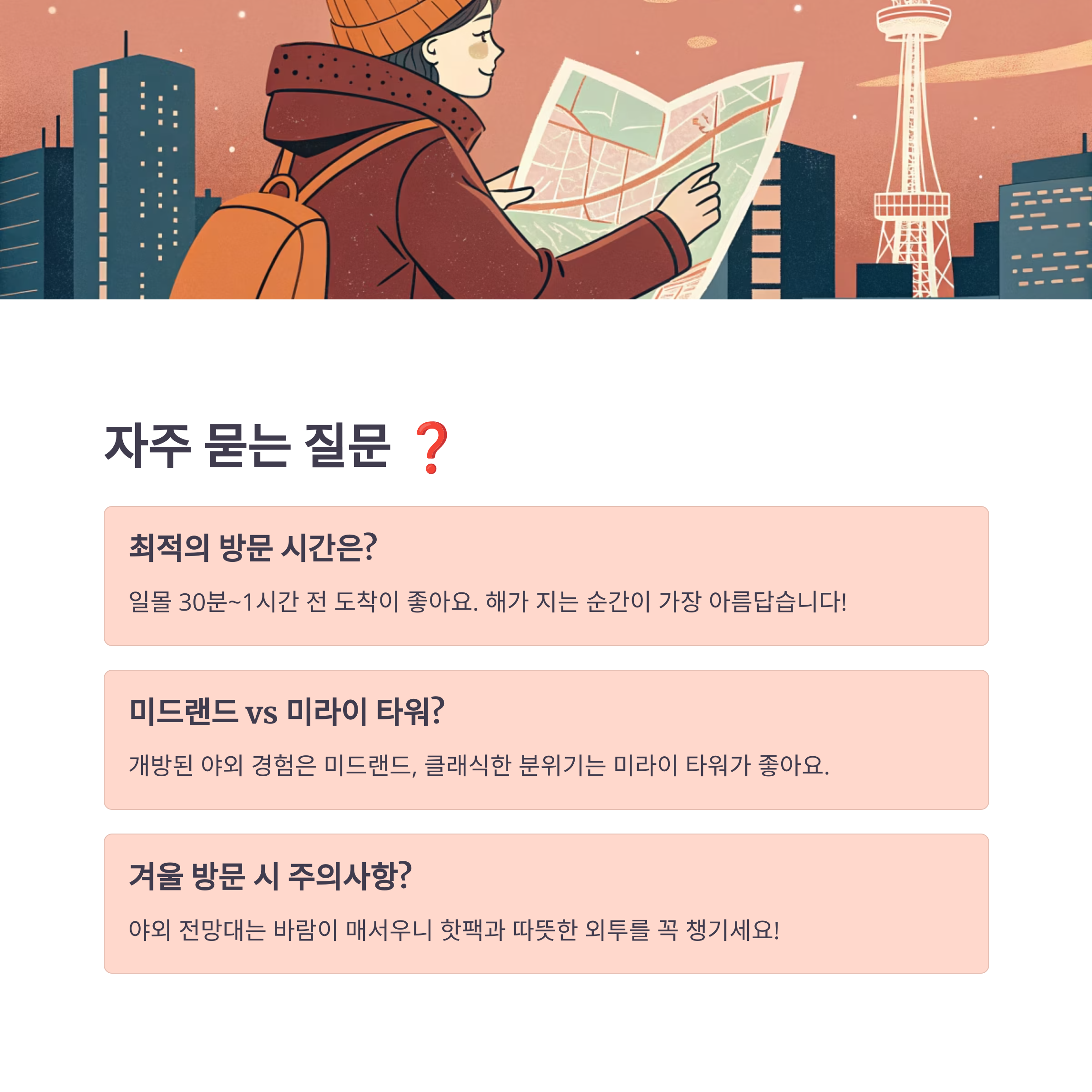 - 방문 시간: 일몰 30분 전쯤 도착해서 해 질 녘부터 밤까지의 풍경 변화를 모두 감상하는 걸 추천해요. 특히 미드랜드 스퀘어나 TV 타워는 이 시간대가 진짜 황홀하답니다.