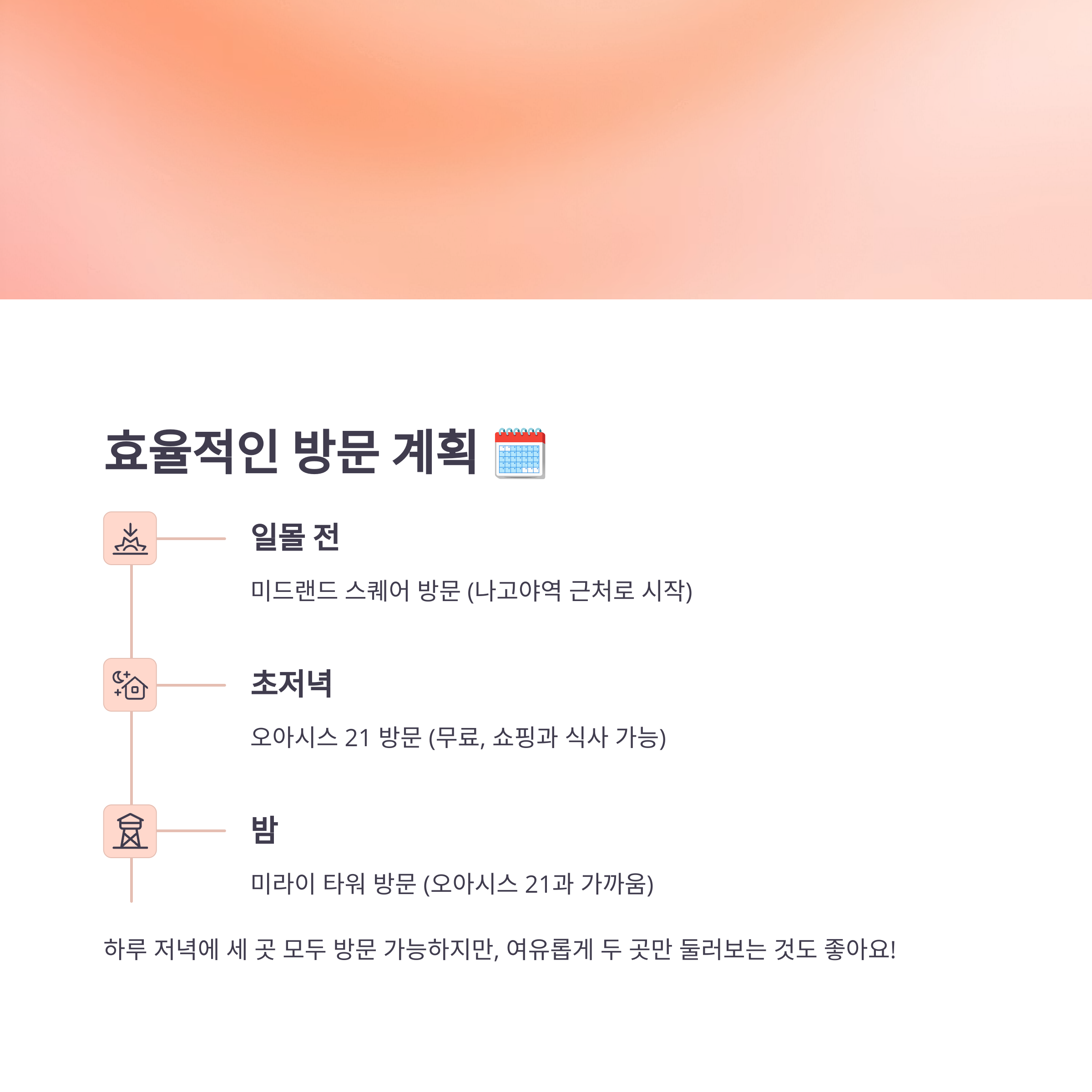 - 동선 고려: 오아시스 21과 미라이 타워는 서로 가까워서 묶어서 방문하기 좋아요. 미드랜드 스퀘어는 나고야역 근처에 있으니, 도착 첫날이나 떠나기 전날 방문하는 동선을 짜면 효율적이에요.