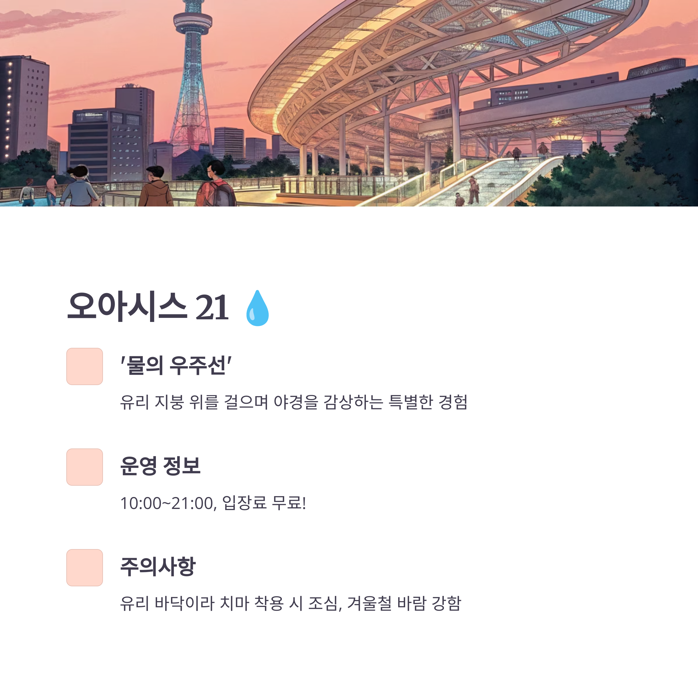 - 운영 시간: '물의 우주선' 10:00 ~ 21:00 (상점가 및 식당은 다름)