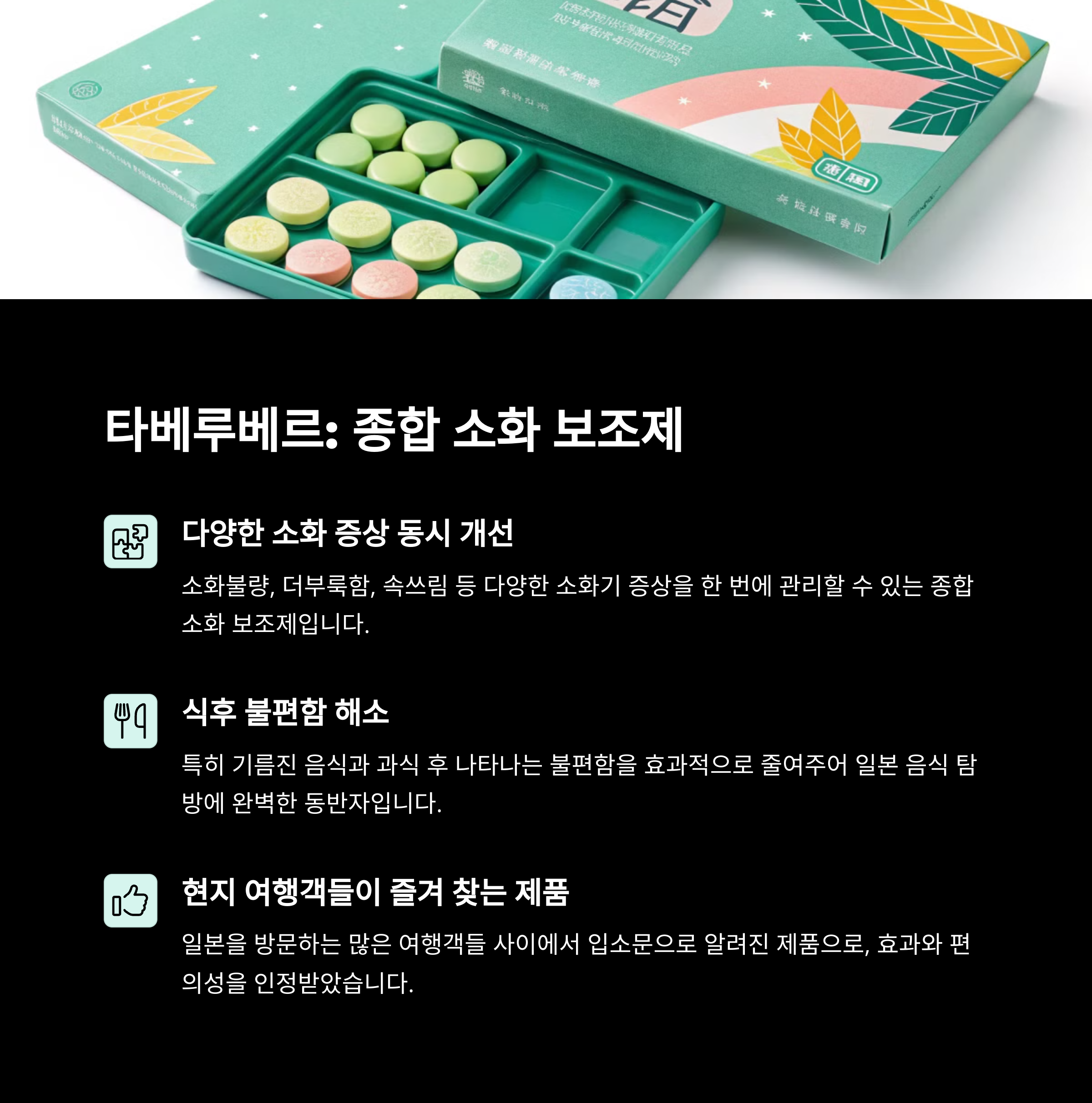 일본 소화제 특징 생약 성분, 빠른 흡수력 등 효과 중심으로 구성