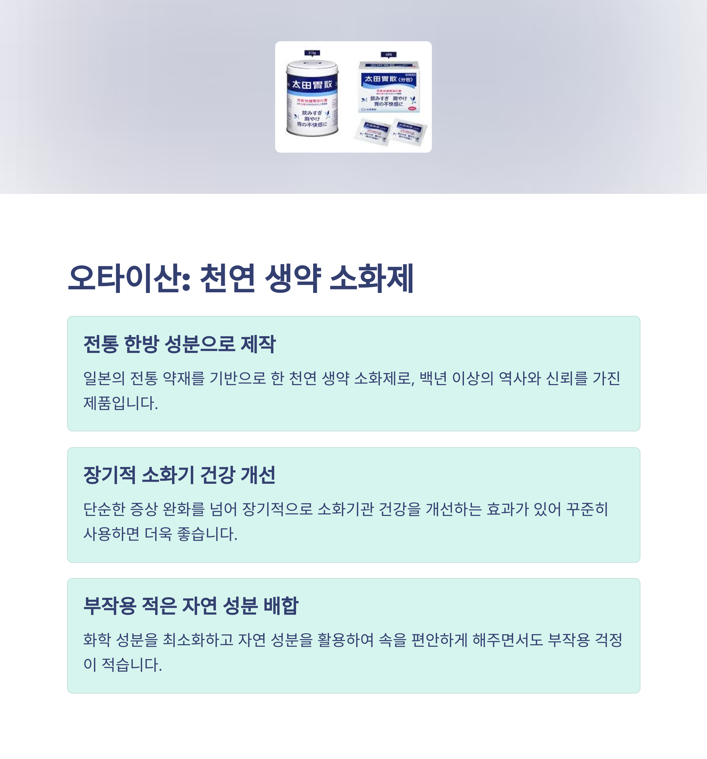 일본 소화제 특징 | 생약 성분, 빠른 흡수력 등 효과 중심으로 구성 |