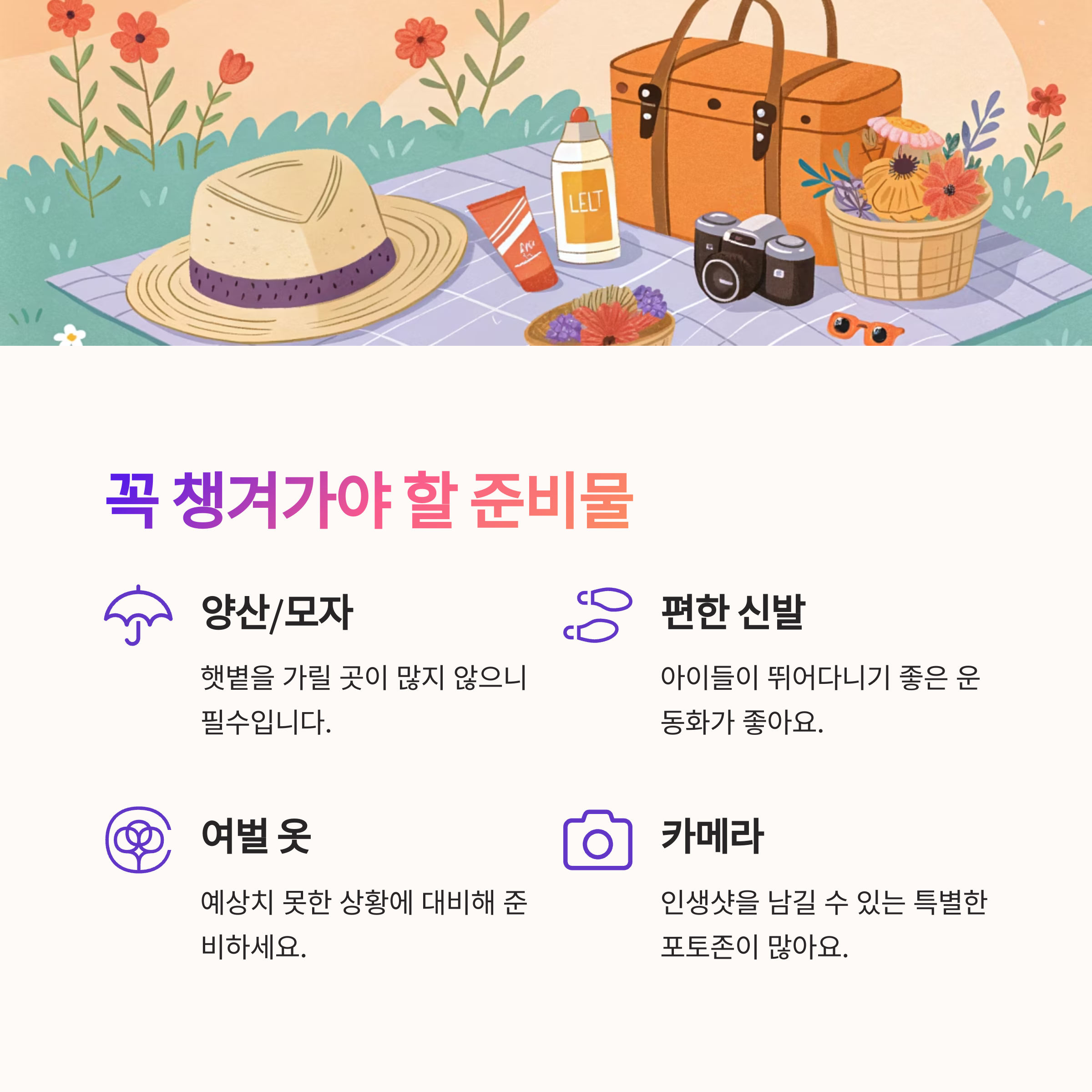 3. 피크닉, 유모차, 사전 정보 확인 등 꼼꼼한 준비로 더욱 즐거운 나들이가 가능해요.