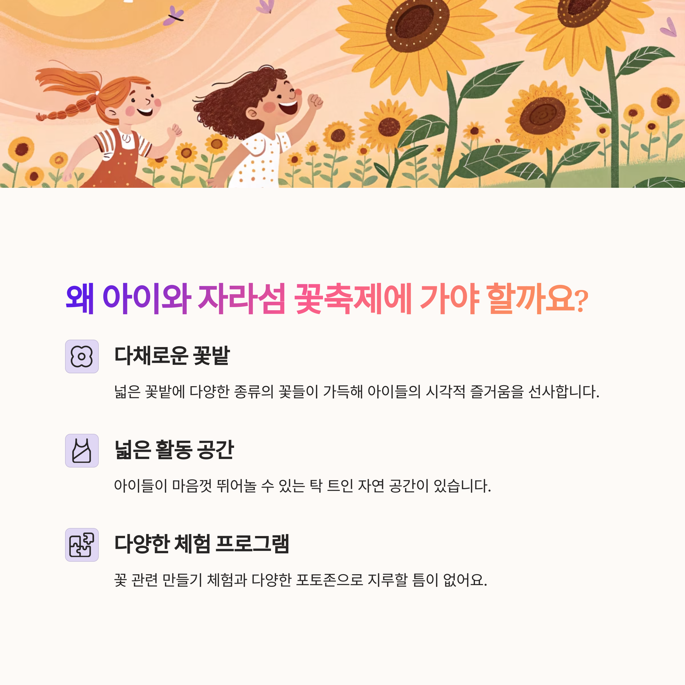 자라섬 꽃축제는 단순히 예쁜 꽃을 보는 것을 넘어, 아이와 함께 성장하고 행복한 추억을 만들 수 있는 소중한 공간이에요. 넓은 자연 속에서 아이들이 마음껏 뛰어놀고, 오감을 자극하며 자연의 아름다움을 느낄 수 있답니다.