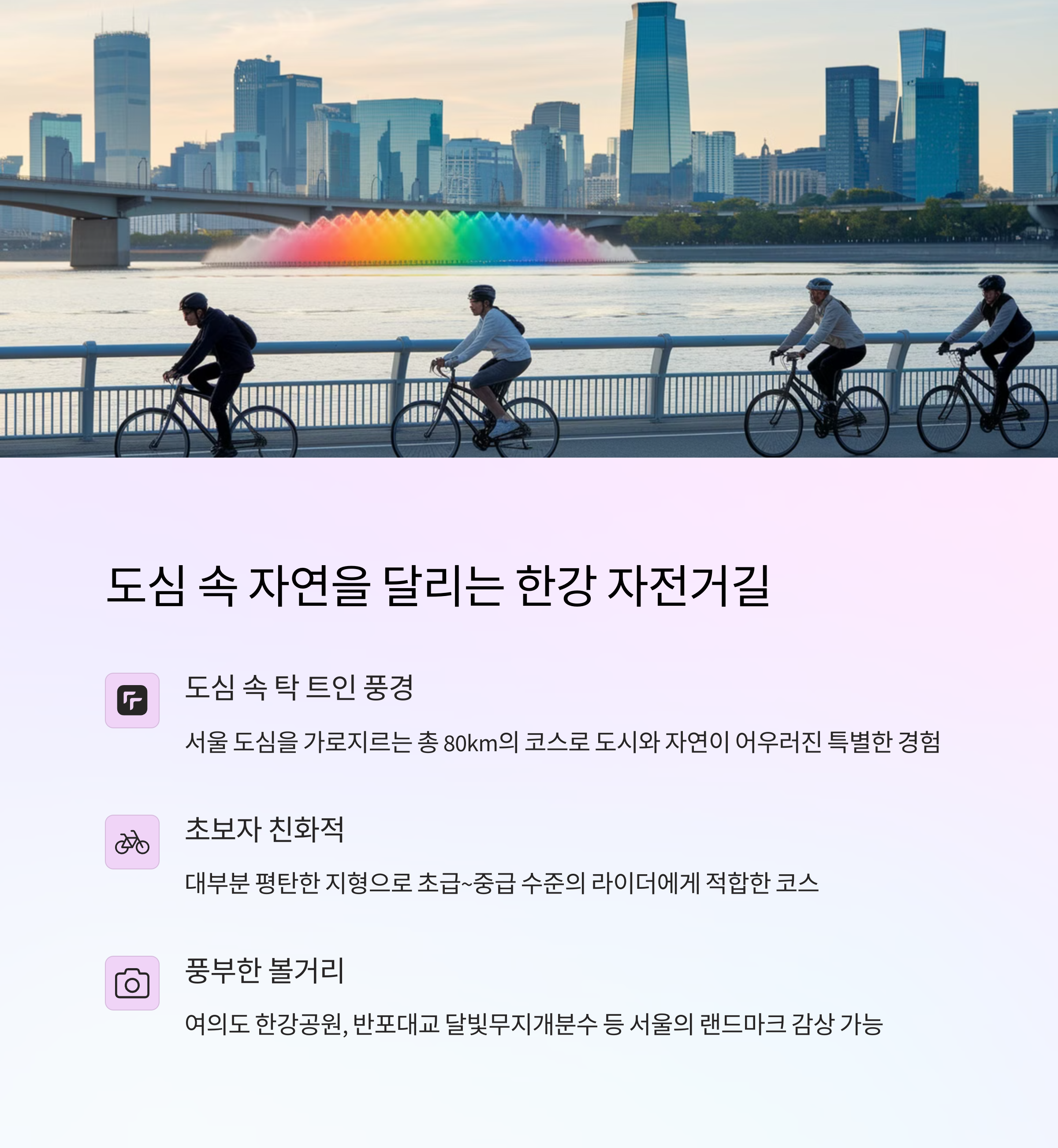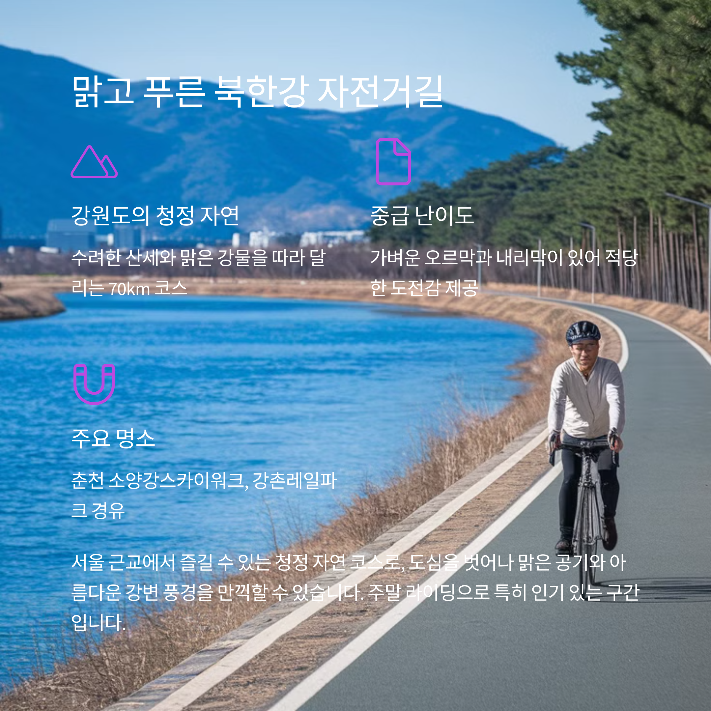 한강길, 제주길, 북한강길 | 3시간 ~ 2박 이상 | 초보부터 전문가까지 맞춤 코스 |