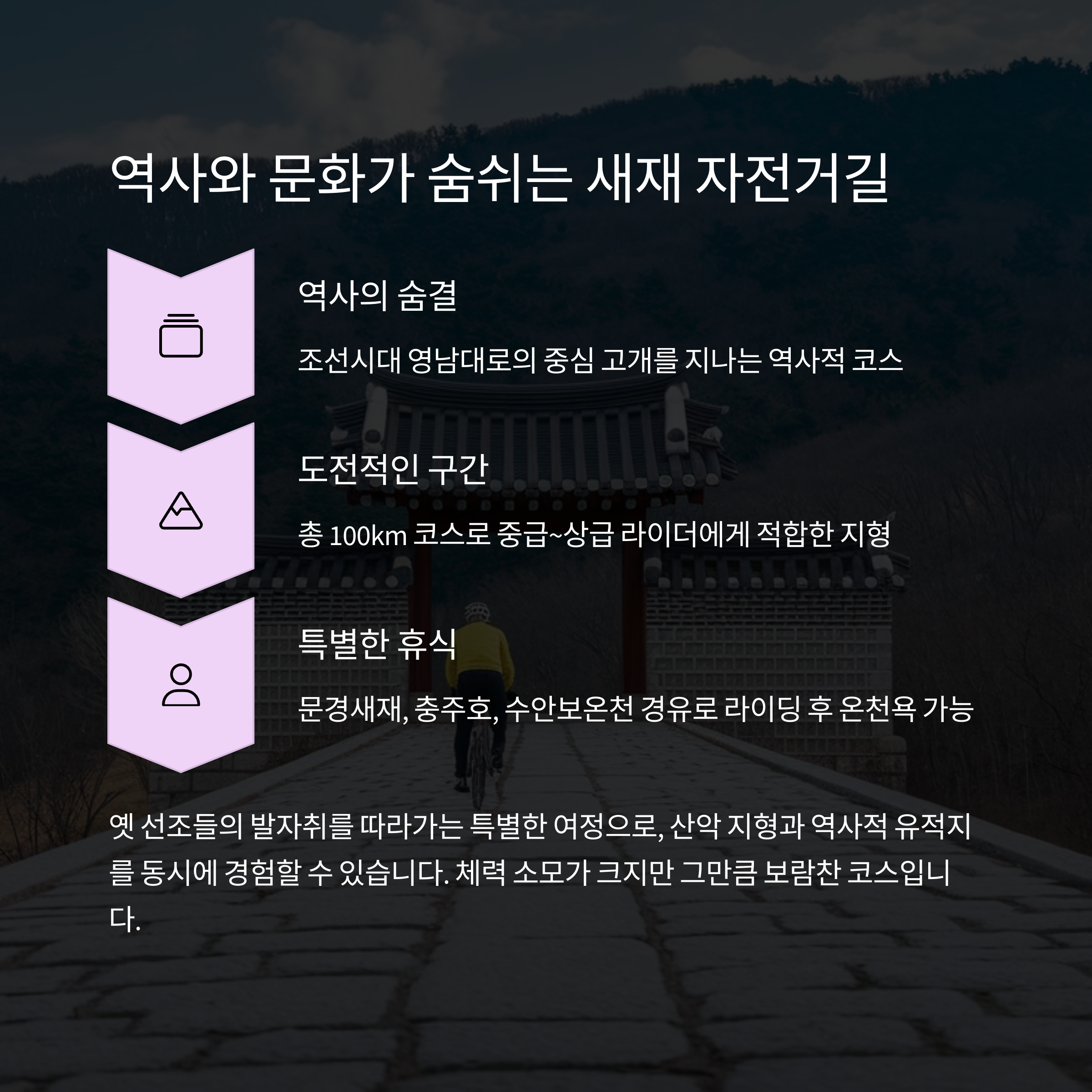 | 새재길, 동해안길 | 반나절 ~ 3일 이상 | 자연+도전+관광을 모두 담은 여정 |