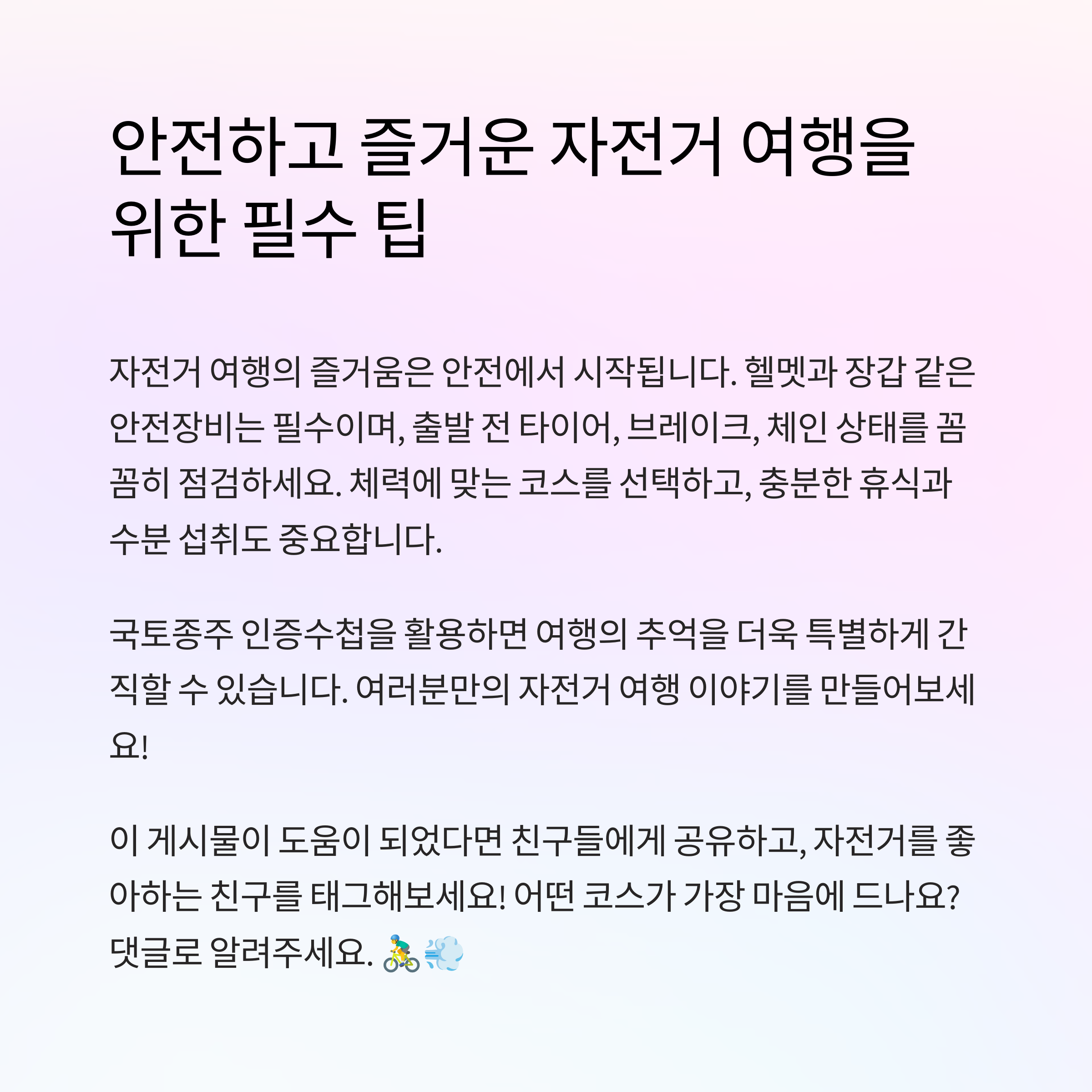 자전거 여행을 떠나보신 적 있으신가요? 가장 인상 깊었던 코스나 추천하고 싶은 장소가 있다면 댓글로 함께 공유해주세요! 여러분의 경험은 많은 사람들에게 큰 도움이 됩니다.