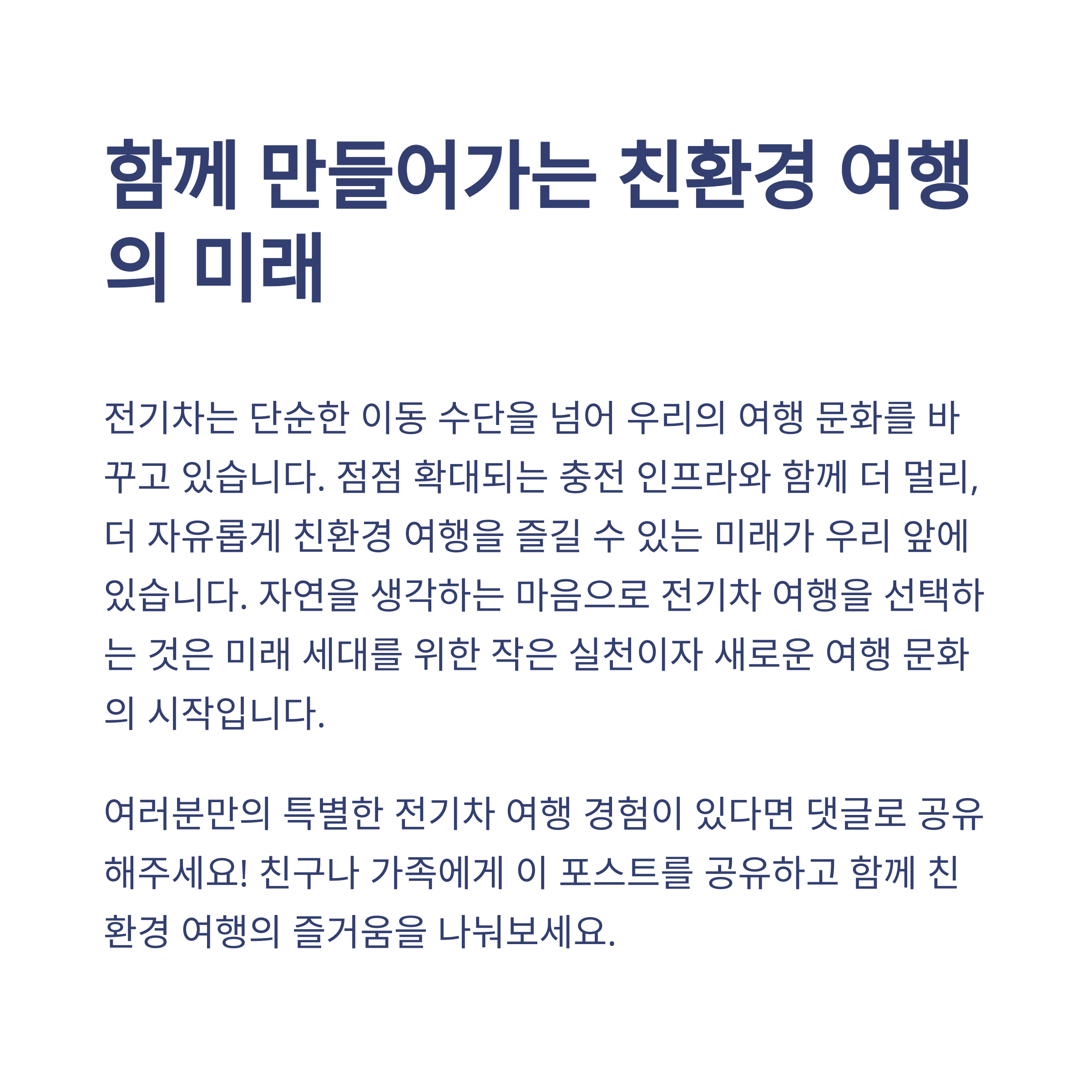 전기차 여행 중 기억에 남는 명소나 추천하고 싶은 충전소가 있으신가요? 댓글로 여러분의 경험과 이야기를 공유해 주세요. 서로의 여행이 더욱 풍성해지는 시간이 되길 바랍니다!