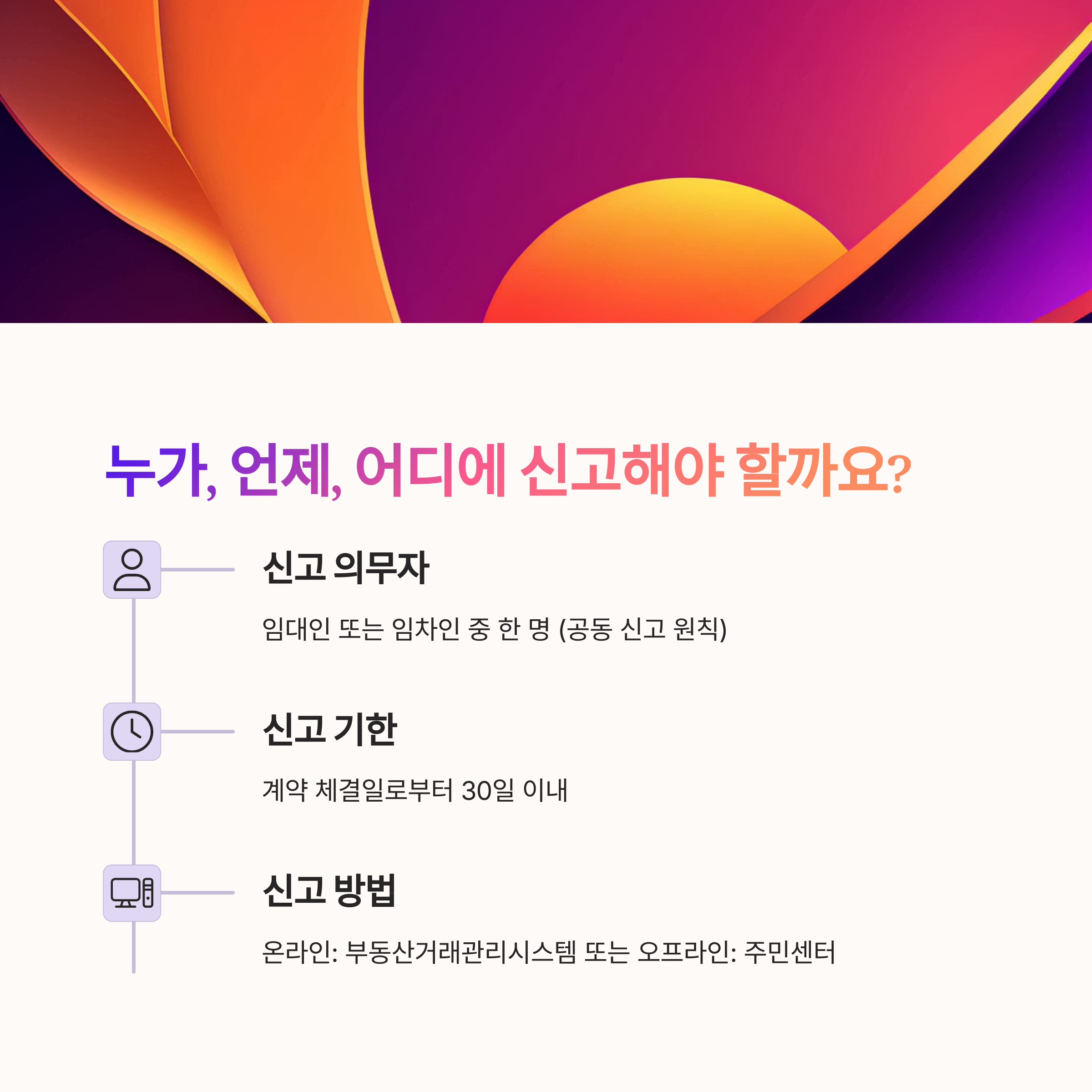 - 신고 대상 확인: 보증금 6천만원 초과 또는 월세 30만원 초과 계약은 필수!