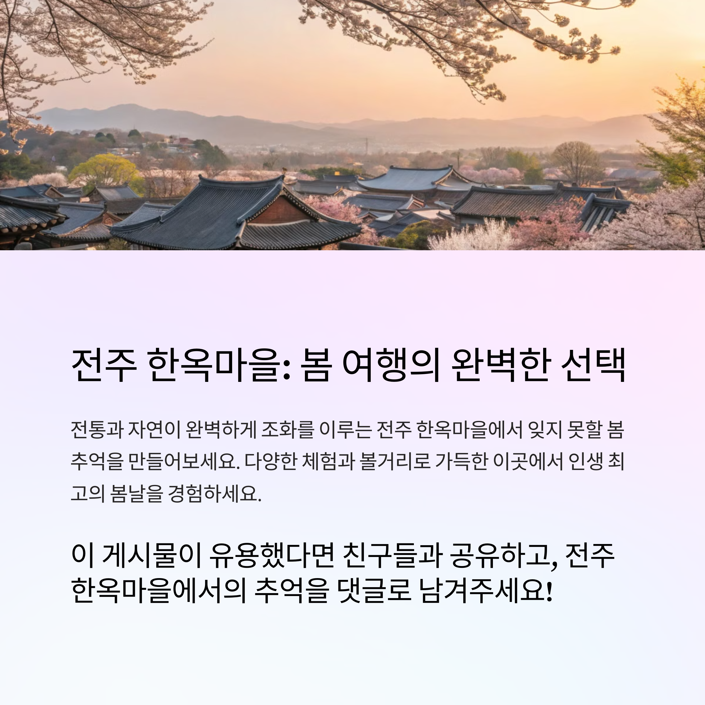 전주 한옥마을에 다녀오신 적이 있으신가요? 혹은 이번 봄 방문을 계획 중이신가요? 궁금하신 점이나 추천하고 싶은 장소가 있다면 댓글로 공유해 주세요. 여러분의 여행 이야기를 기다립니다!