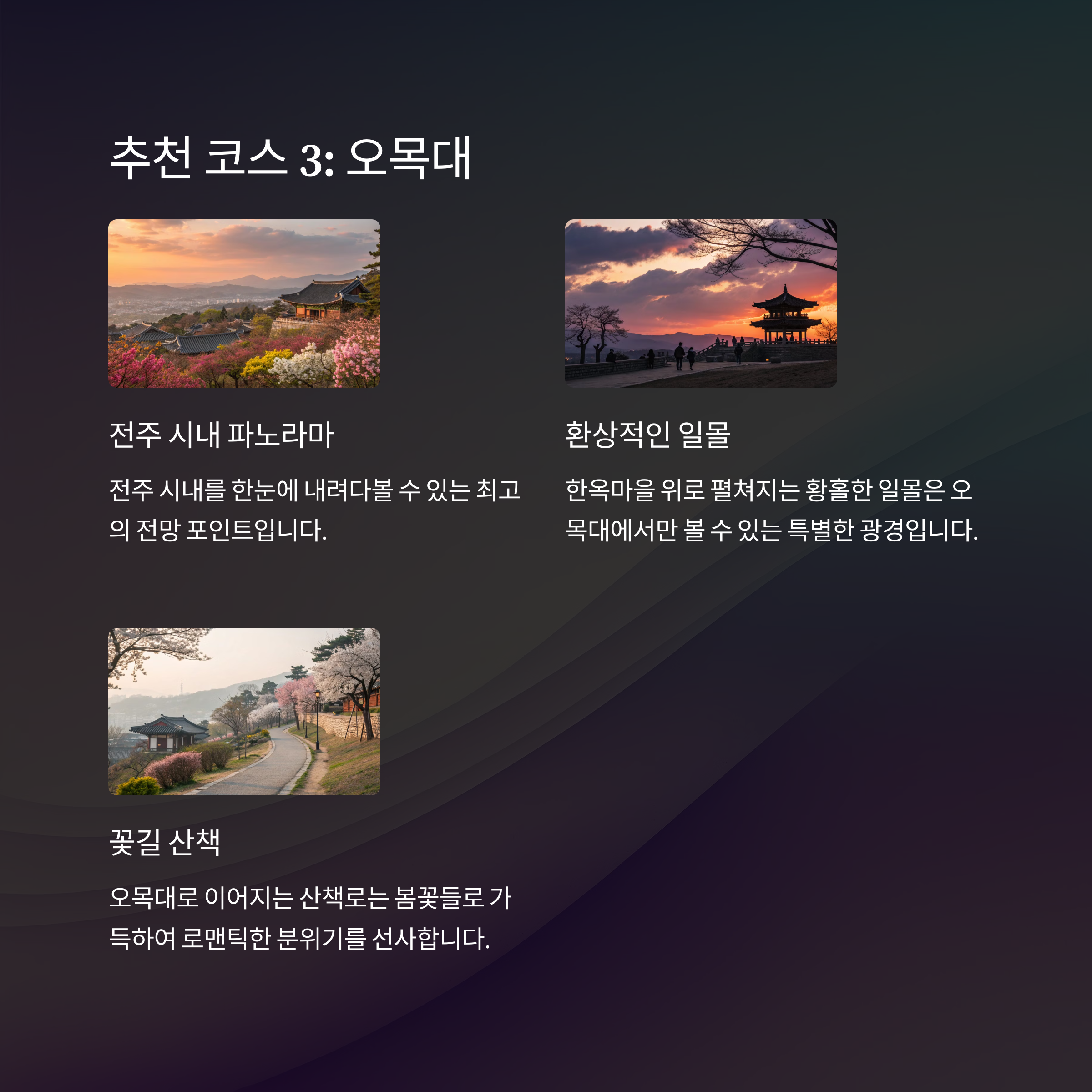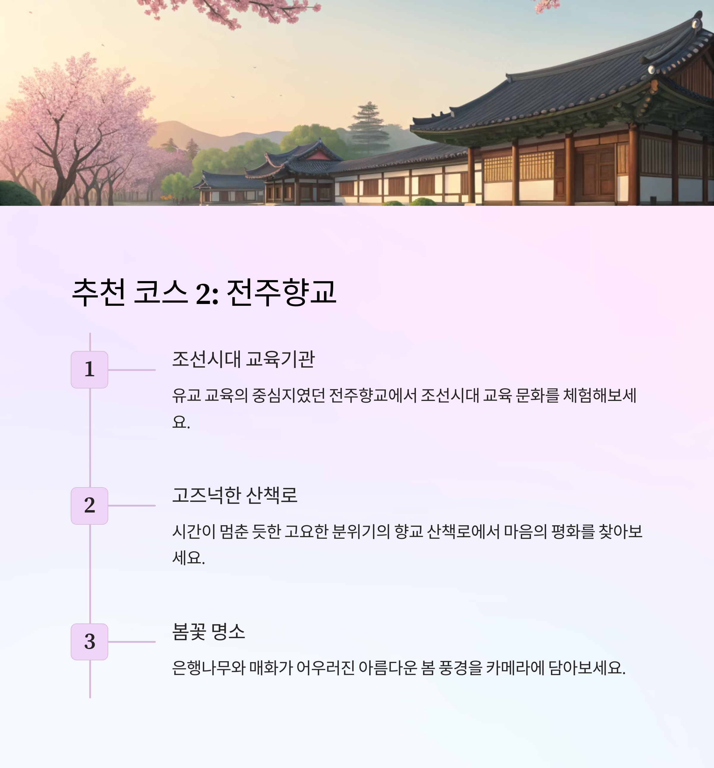 봄철 전주 한옥마을 방문 시, 경기도전과 전주향교, 오목대 전통정원을 코스로 함께 둘러보는 것을 추천합니다. 각 명소는 도보로 이동 가능한 거리에 위치해 있으며, 역사적 가치뿐만 아니라 봄꽃과 어우러진 풍경도 뛰어납니다. 또한 주말이나 연휴에는 관광객이 몰릴 수 있으므로 한복 대여나 전통 음식 체험은 사전 예약이 도움이 됩니다. 교통은 전주역에서 접근이 편리하고, 주차 공간이 부족한 편이므로 대중교통 이용이 현명한 선택이 될 수 있습니다.