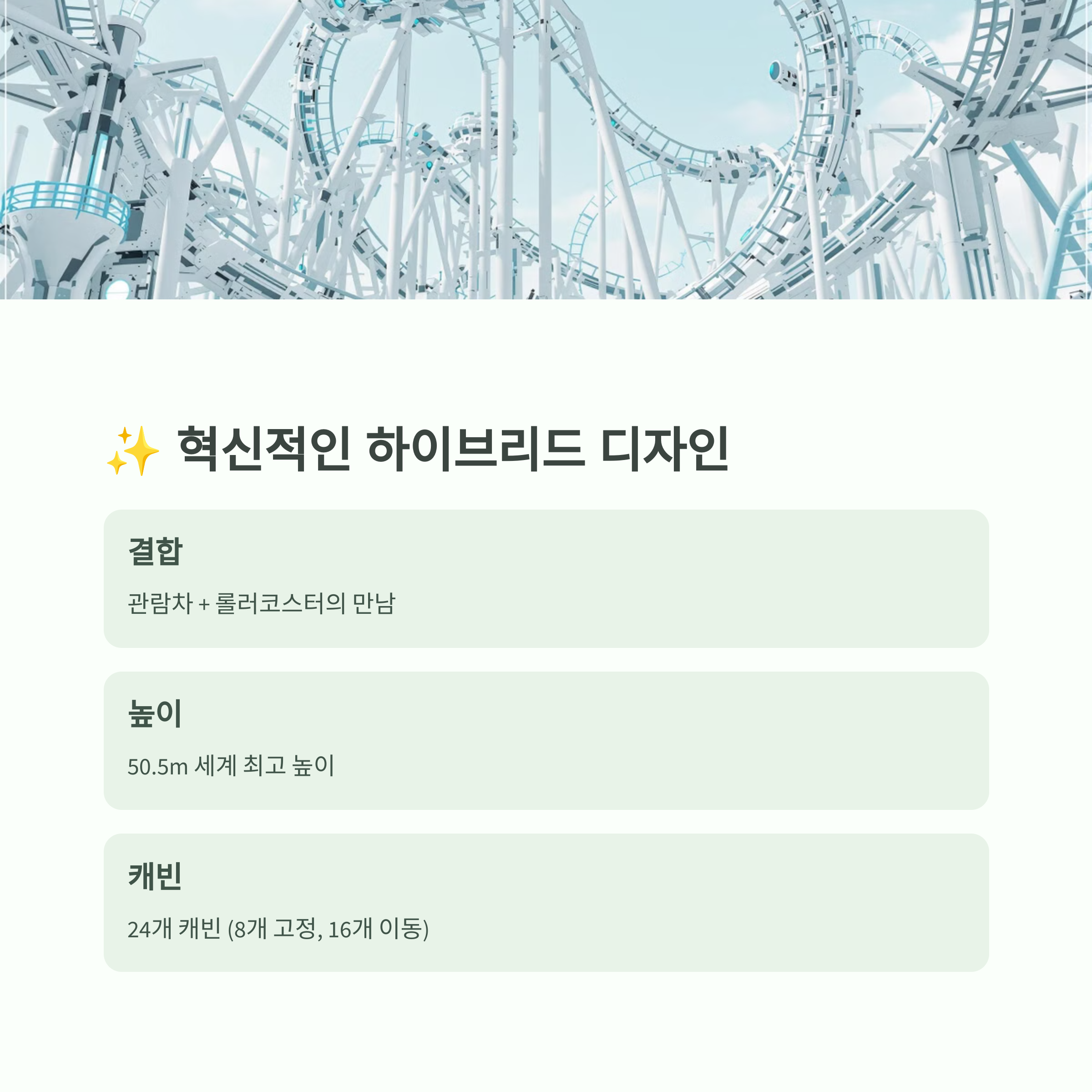 관람차의 여유로운 전망과 롤러코스터의 짜릿한 스릴을 동시에 경험할 수 있는 유일한 어트랙션입니다. 이러한 하이브리드 특성은 다양한 연령층과 취향을 만족시킬 수 있는 장점을 가지고 있습니다. 🔄