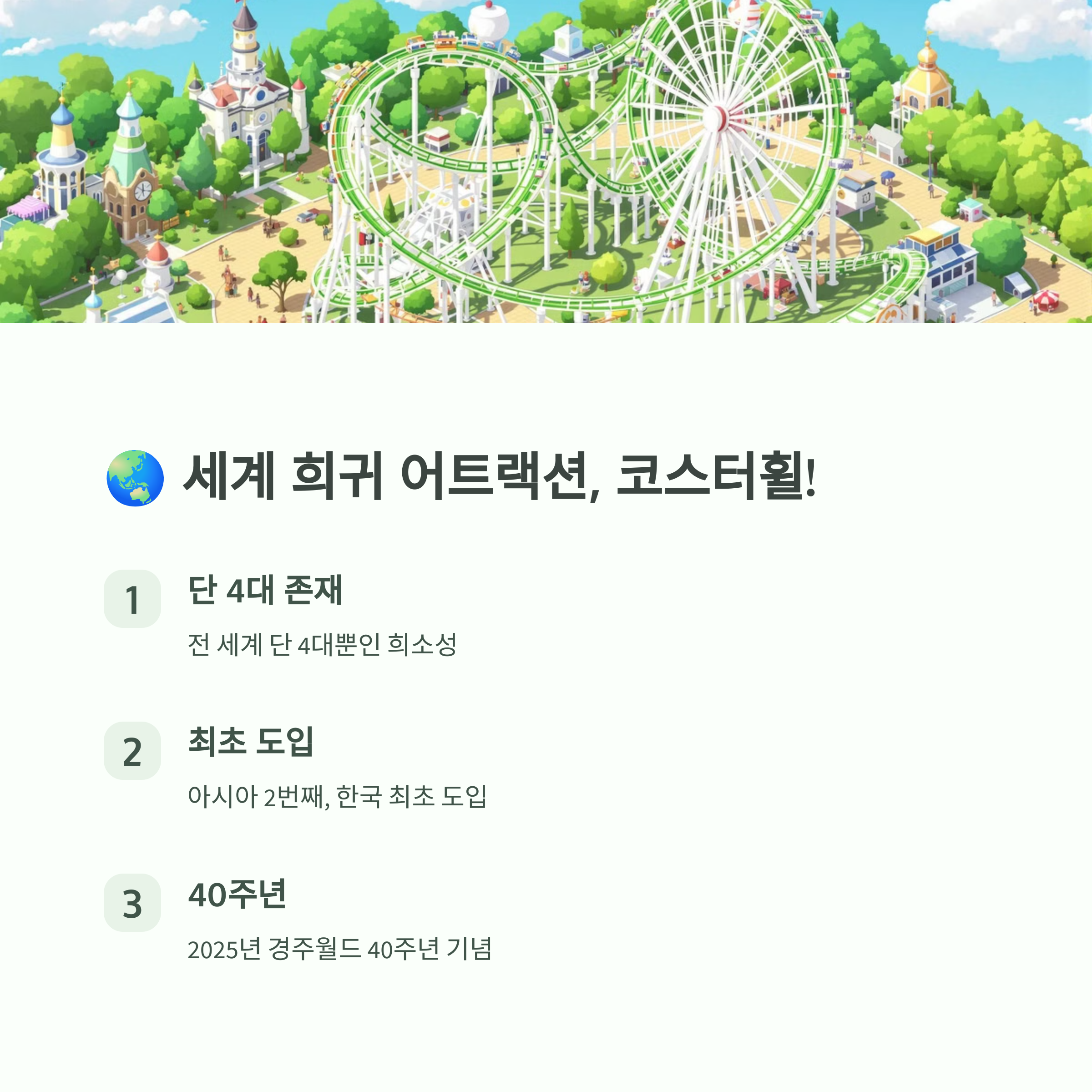경주월드는 2025년 개장 40주년을 맞이해 전 세계적으로 단 4대밖에 없는 특별한 어트랙션 '코스터휠'을 도입했습니다. 아시아에서는 중국에 이어 두 번째, 한국에서는 최초로 선보이는 이 놀이기구는 단순한 관람차가 아닌 롤러코스터의 요소를 접목한 하이브리드 어트랙션입니다. 🌟