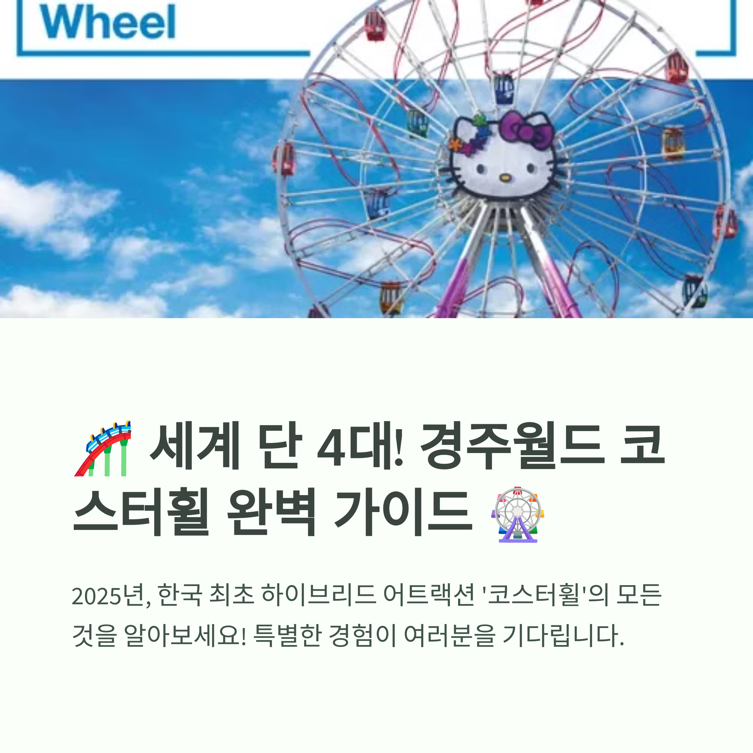 경주월드가 개장 40주년을 맞아 한국 최초로 선보이는 하이브리드 어트랙션 '코스터휠'에 대한 모든 것을 알아보세요. 관람차와 롤러코스터의 장점을 결합한 이 희소성 높은 놀이기구는 경주를 방문하는 모든 여행객들에게 특별한 경험을 선사할 것입니다. ✨