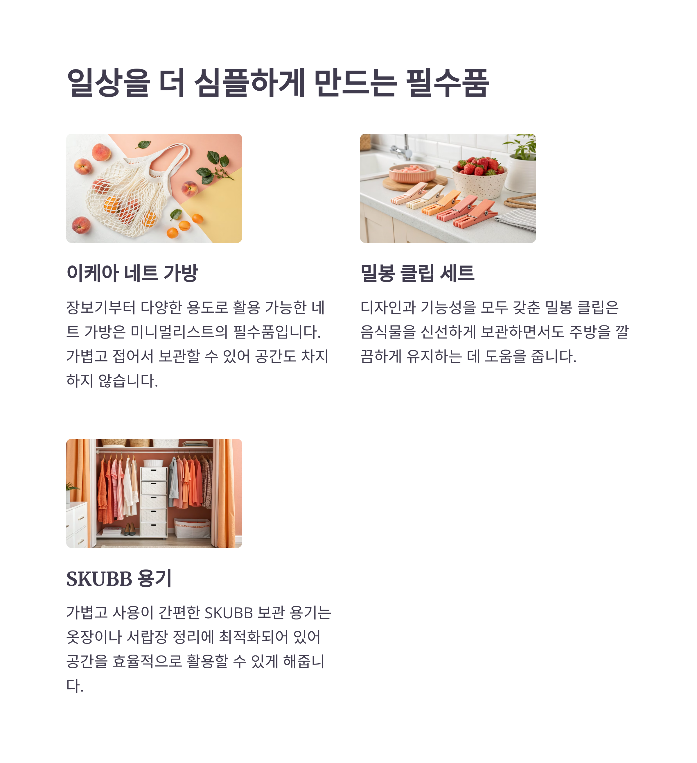 효율적이고 실용적인 아이템은 미니멀라이프를 더욱 풍요롭게 만들어 줍니다.