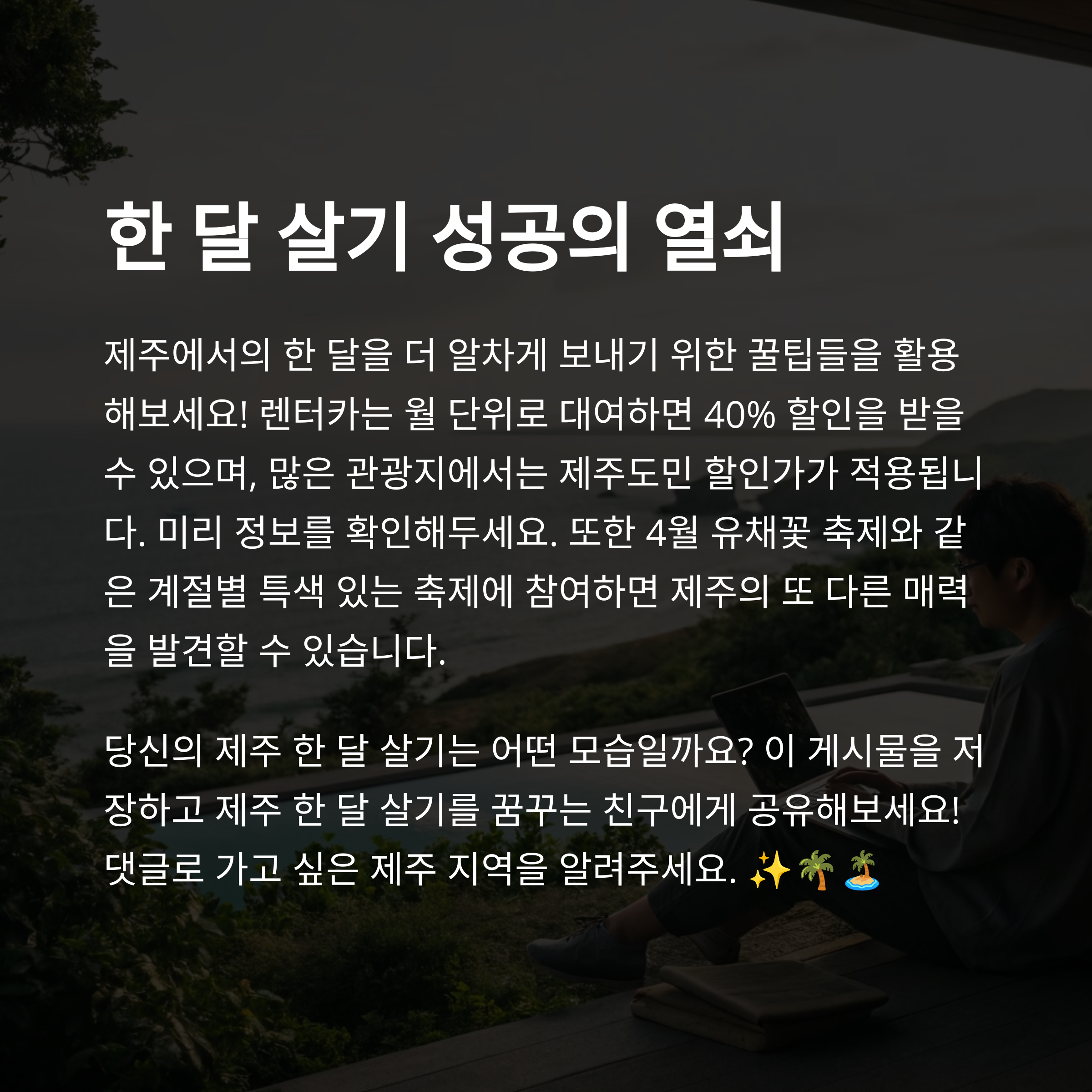 제주도 한 달 살기에 대해 궁금한 점이 있으신가요? 혹은 여러분만의 힐링 장소가 있다면 댓글로 함께 나눠주세요. 더 많은 사람들이 제주를 느끼고 경험할 수 있도록 소중한 의견 기다리고 있습니다.