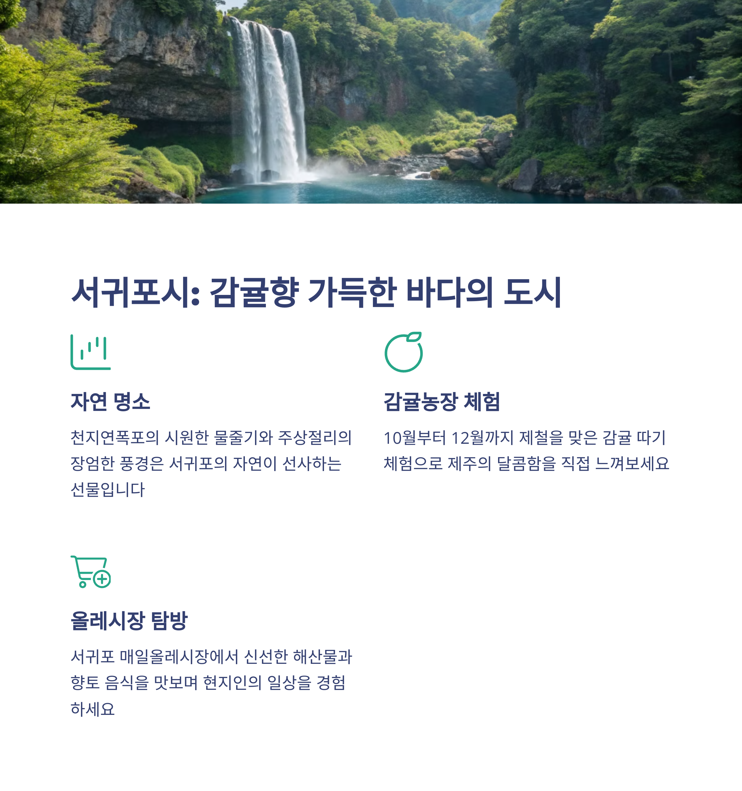 | 힐링 포인트 | 감귤밭 체험, 오름 트래킹, 해녀 문화 등 치유의 시간 제공 |