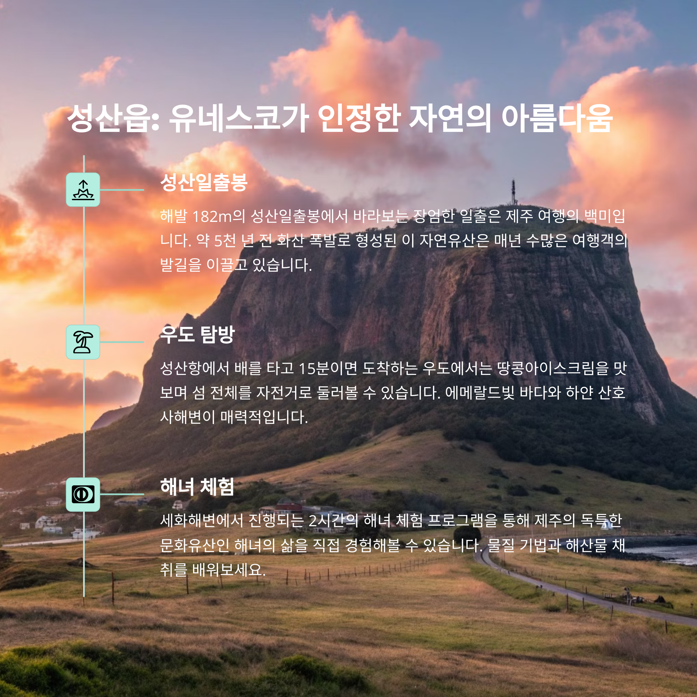 힐링 포인트 | 감귤밭 체험, 오름 트래킹, 해녀 문화 등 치유의 시간 제공 |