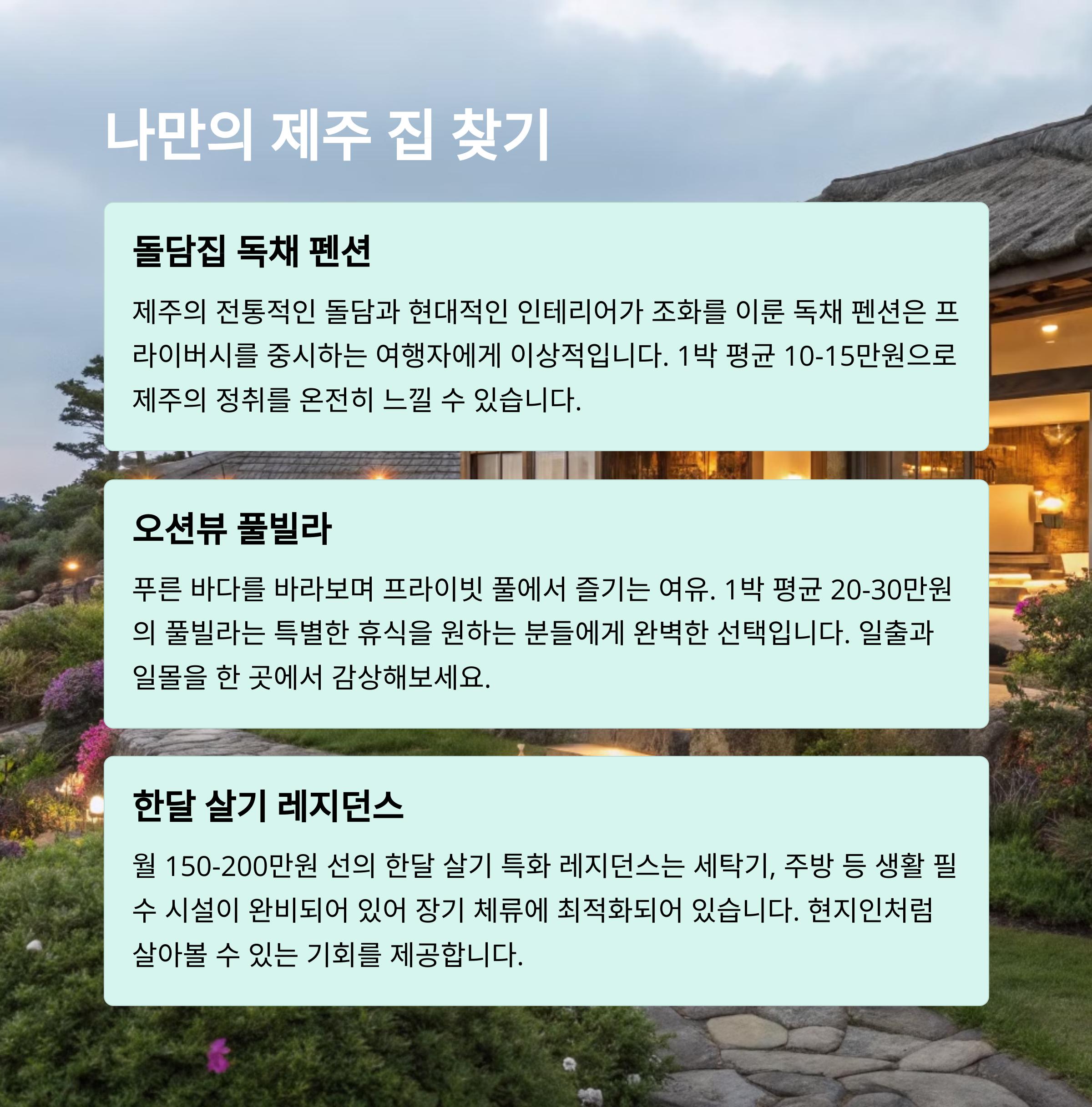 | 제주시, 서귀포시, 애월읍, 성산읍 | 윤스테이, 풀빌라, 반려동물 가능 아파트 | 오름 트래킹, 해녀 체험, 감귤밭 체험 |