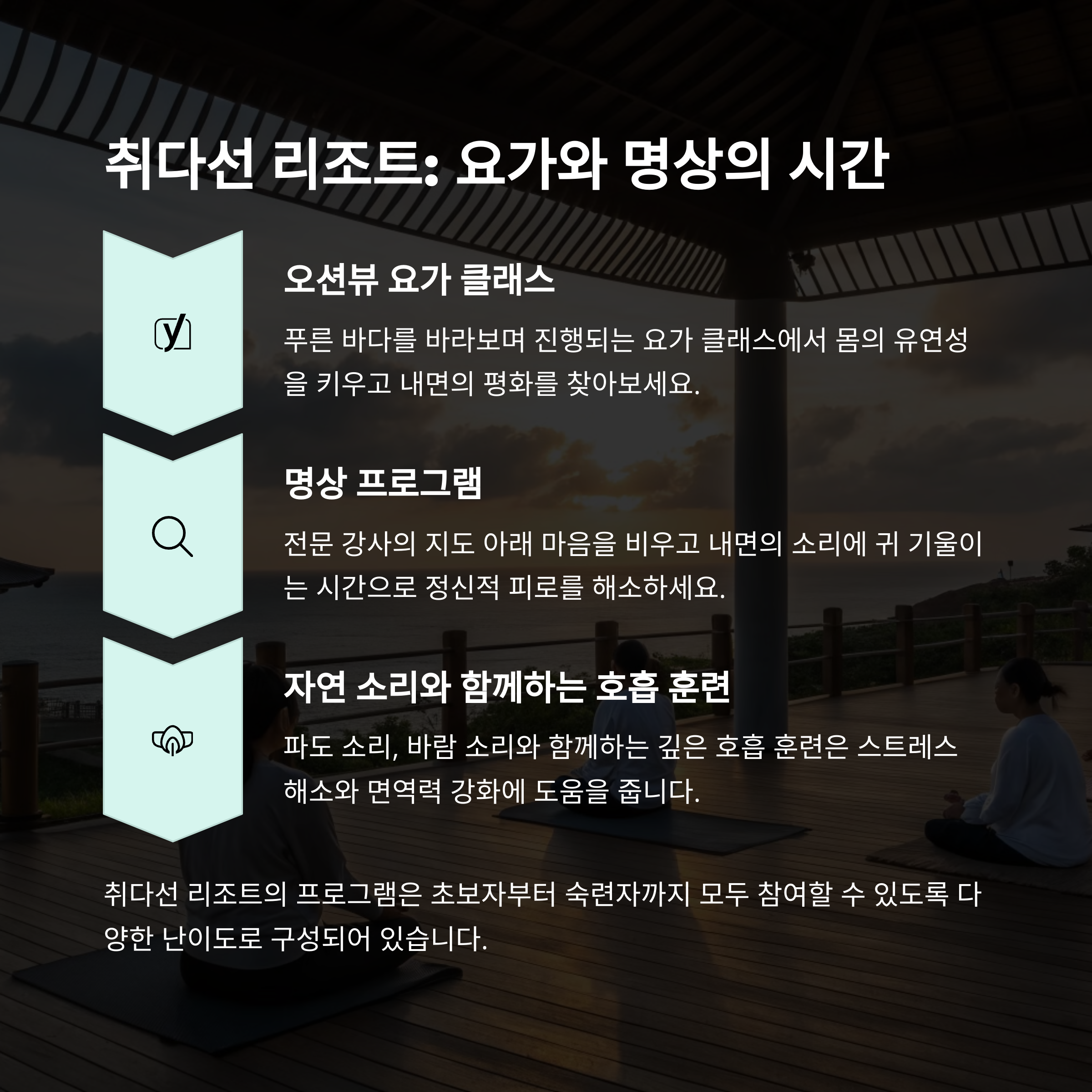 제주도의 또 다른 힐링 코스는 다양한 체험 프로그램입니다. 제주허브동산에서는 아로마 족욕 체험과 필라테스 교육, 천연비누 만들기까지 가능한데요. 단순히 관광이 아닌 나만의 힐링 시간을 갖기에 안성맞춤입니다. 또한, 취다선 리조트는 명상과 요가 프로그램이 마련되어 있어 바쁜 일상에서 벗어나 온전한 쉼을 누릴 수 있는 최적의 장소입니다. 자연과 어우러진 프로그램들은 감정 정화에도 큰 도움을 줍니다.