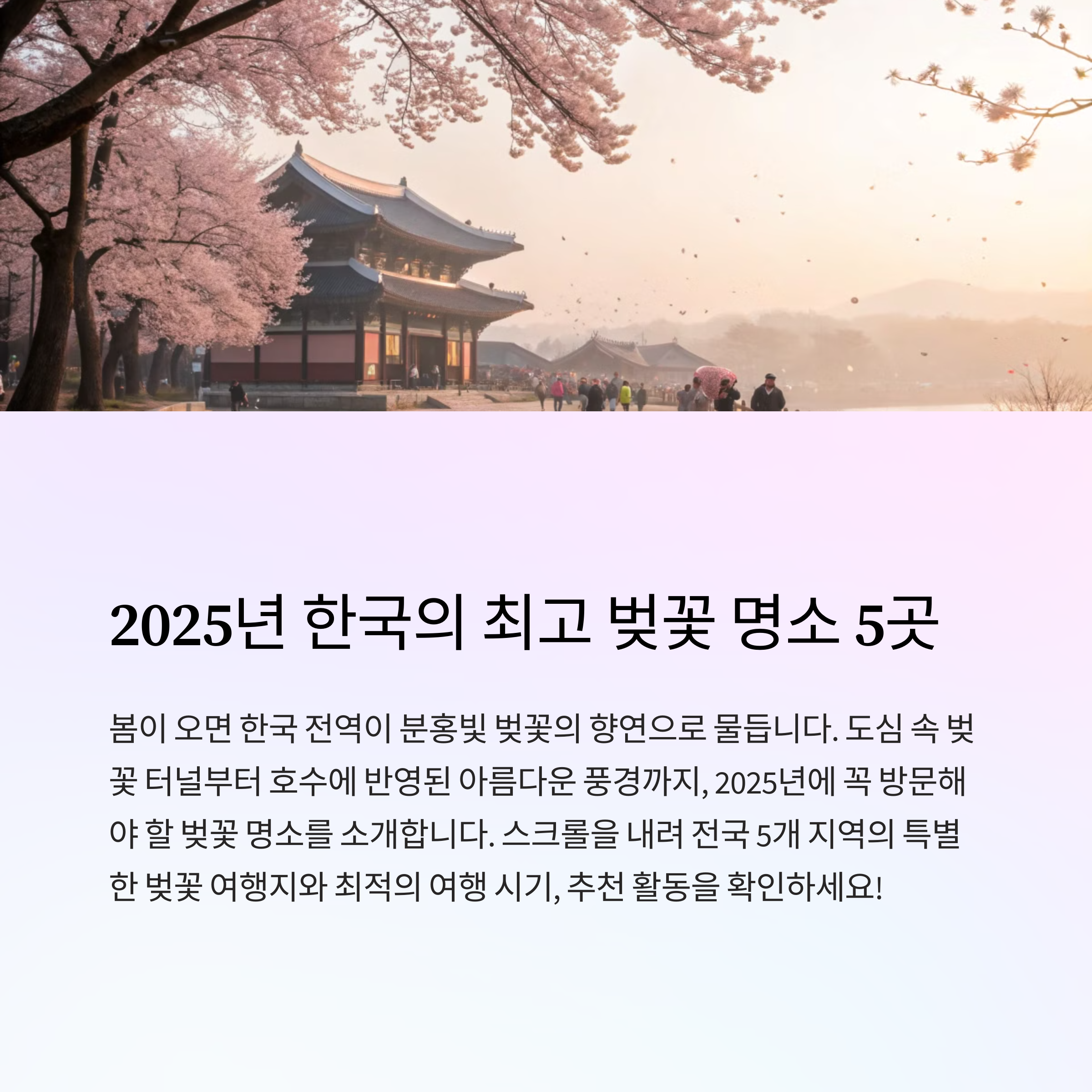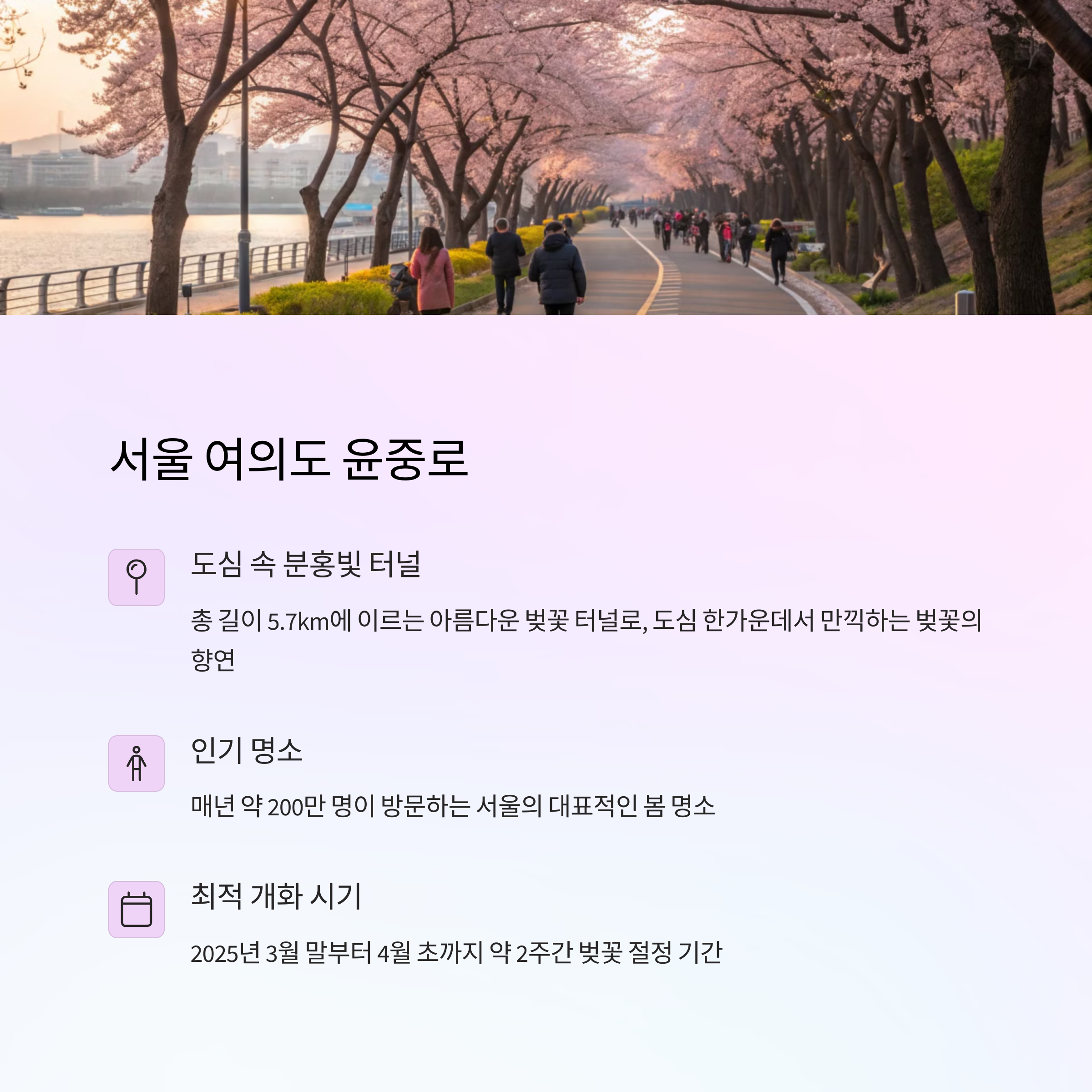 | 벚꽃 개화 시기 | 2025년 3월 말부터 4월 중순까지 지역별 상이 |