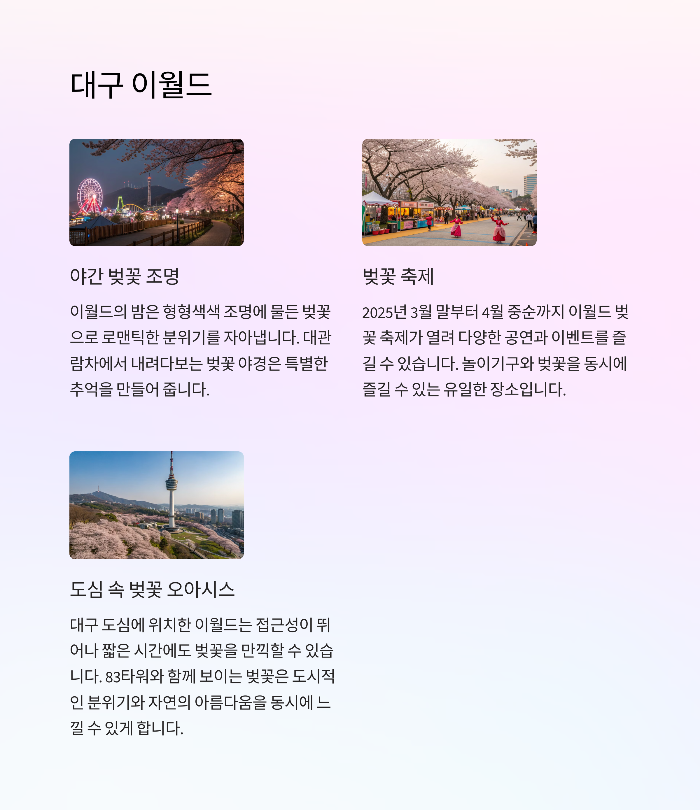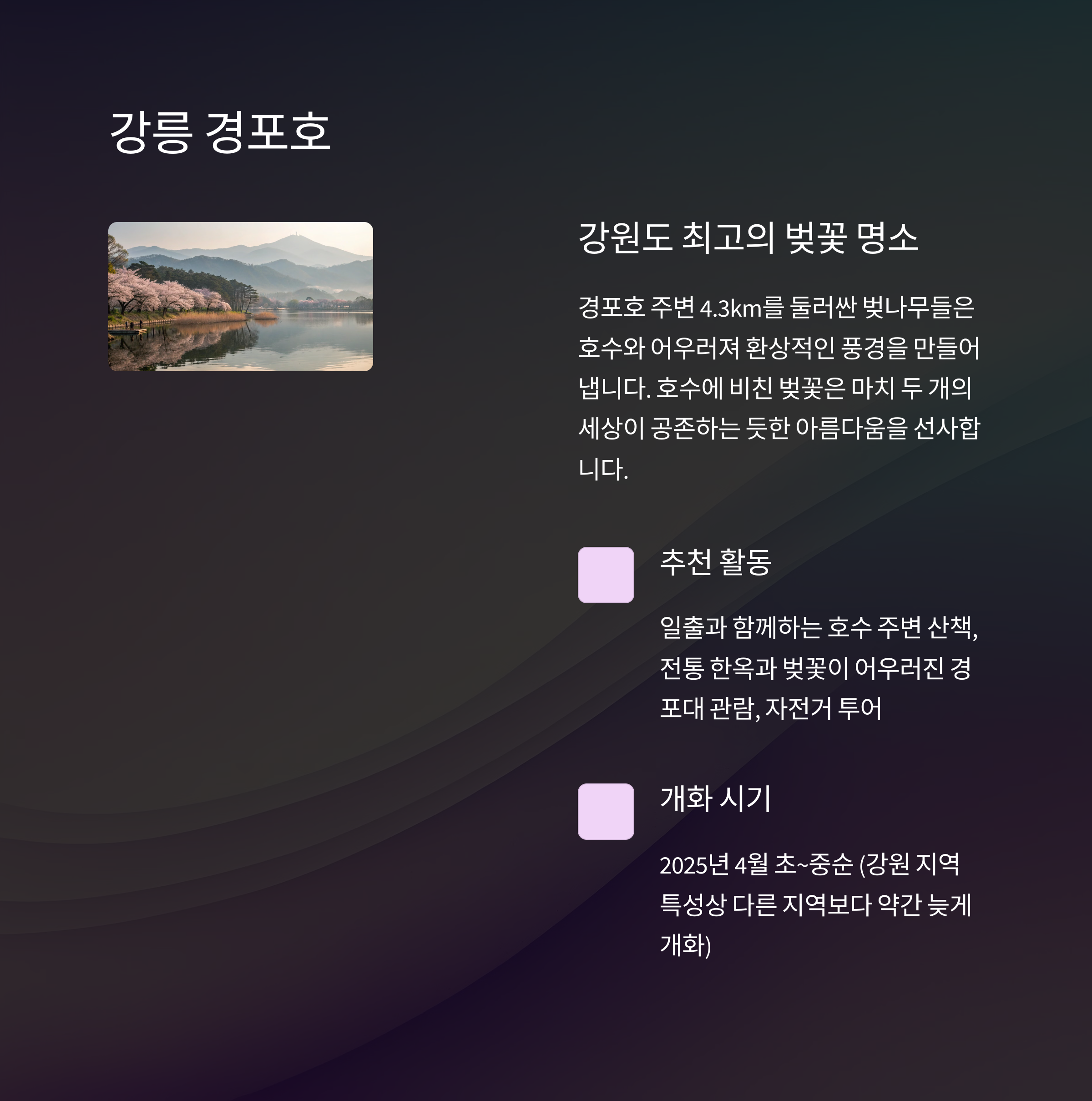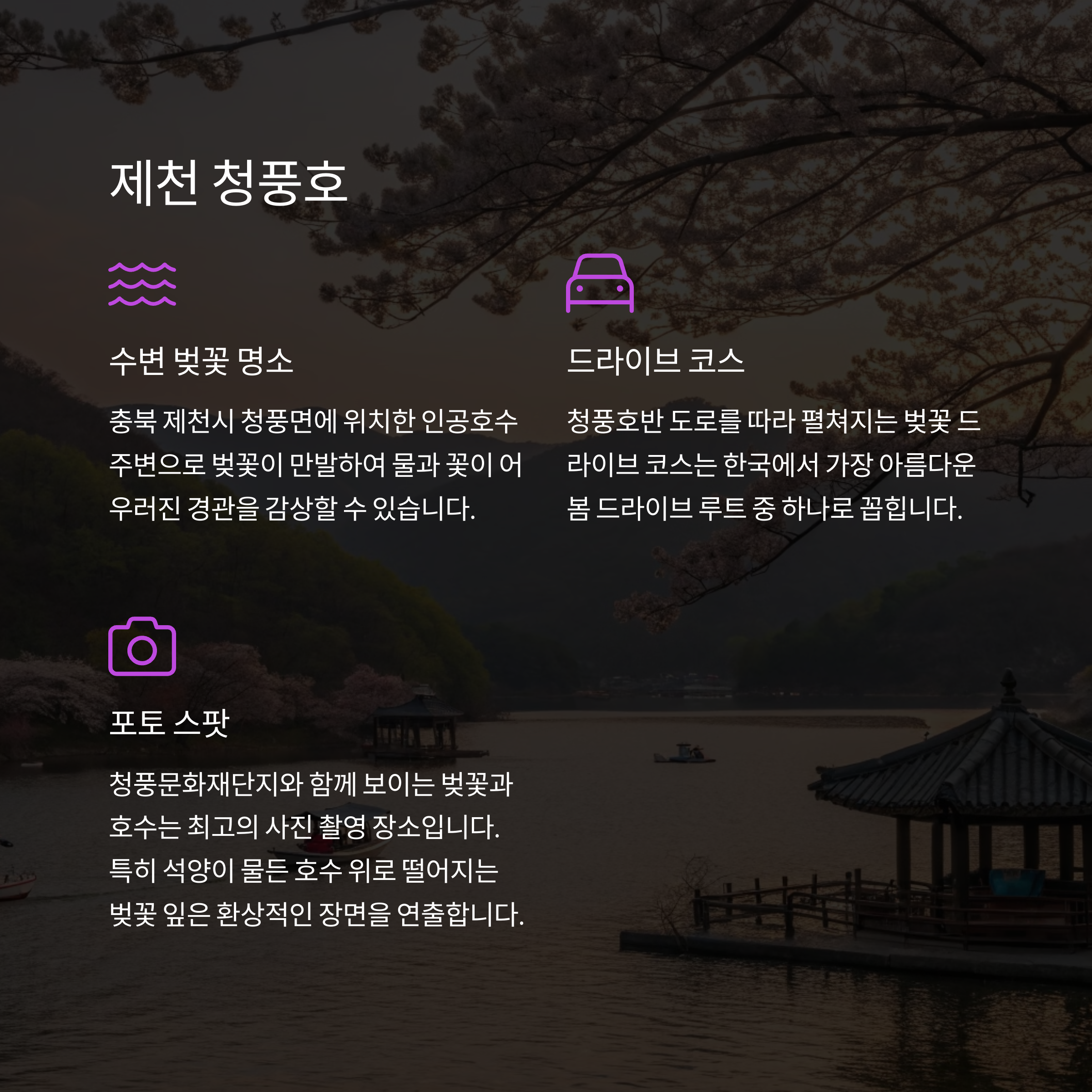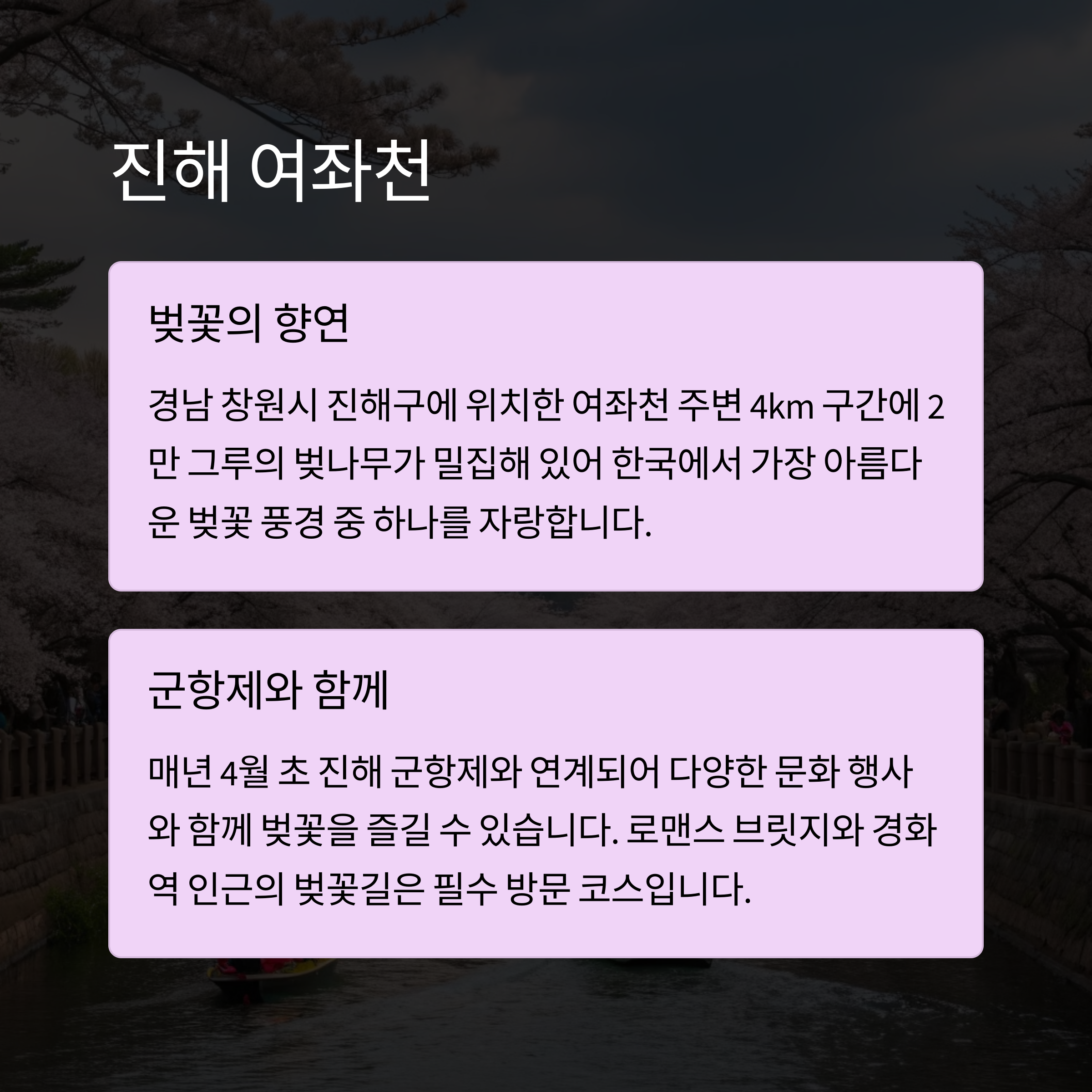 | 한강 따라 벚꽃길과 야경을 동시에 즐길 수 있음 | 진해군항제 개최, 벚꽃 사진 명소로 유명 | 호수와 바다를 동시에 감상 가능한 특별한 풍경 |