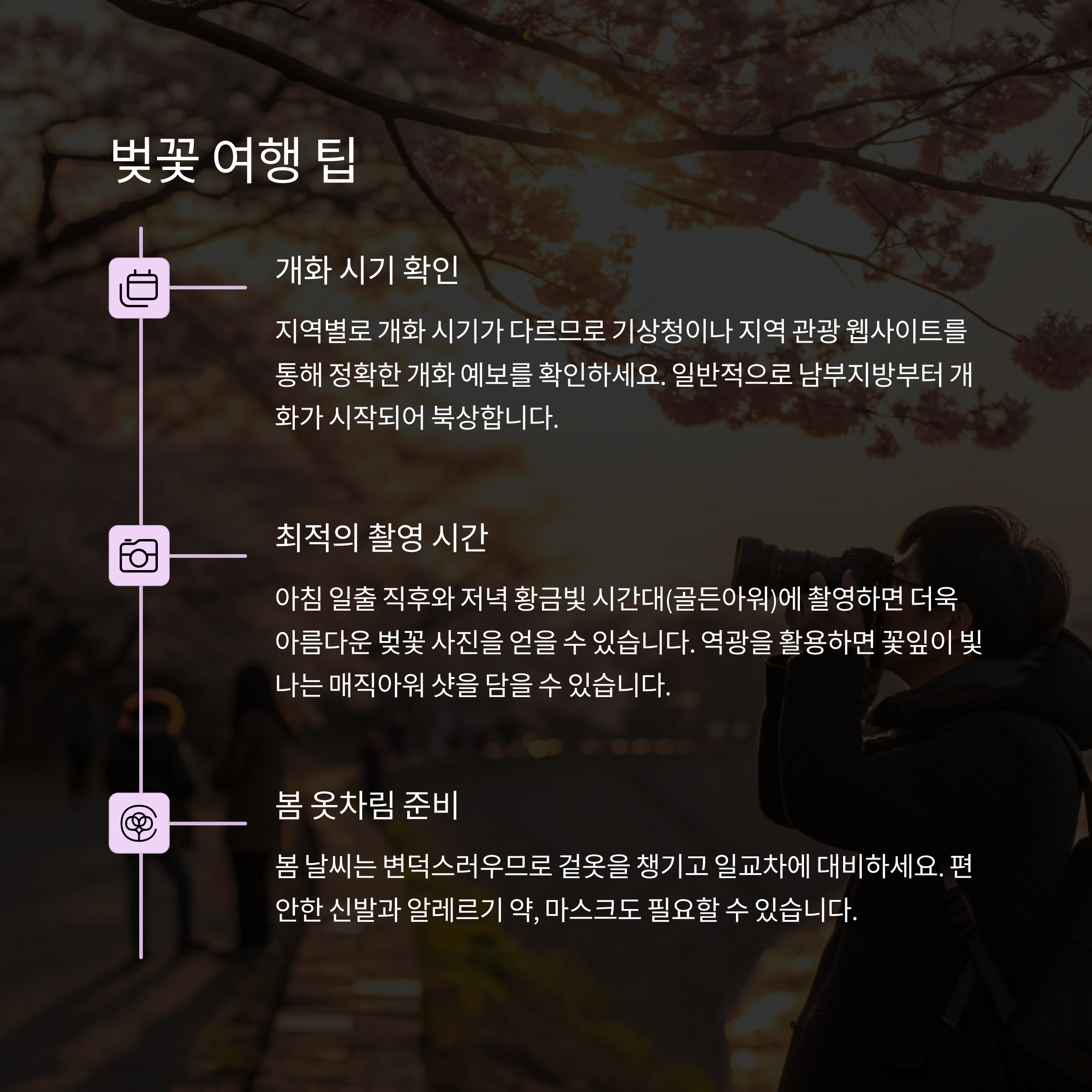 벚꽃 여행을 제대로 즐기기 위해서는 개화 시기를 잘 확인하고 방문 계획을 세우는 것이 중요합니다. 각 지역의 특징에 맞춰 다양한 체험 활동을 준비하면 더욱 알찬 시간을 보낼 수 있습니다. 또한 벚꽃 사진 촬영을 원한다면 오전 시간대나 조명이 들어오는 야간에 방문하는 것이 좋습니다. 한 번뿐인 벚꽃 시즌을 위해 지금 당장 여행 일정을 계획해보세요!