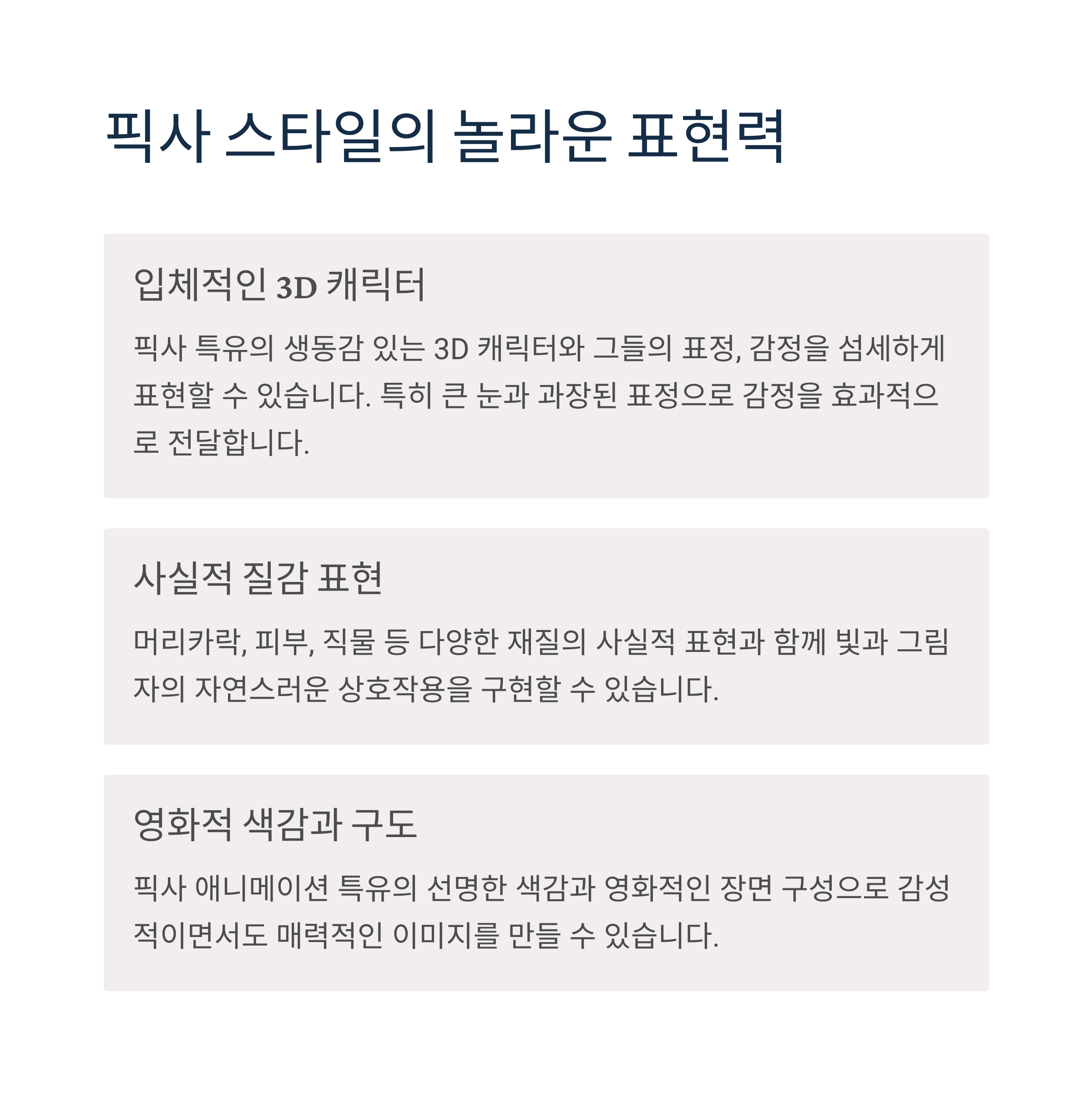 애니메이션은 감정 전달이 뛰어나고, 시각적으로도 매력적입니다. 특히 지브리의 감성적 배경이나 픽사의 입체감 있는 캐릭터는 많은 사람들이 선호하는 스타일입니다.