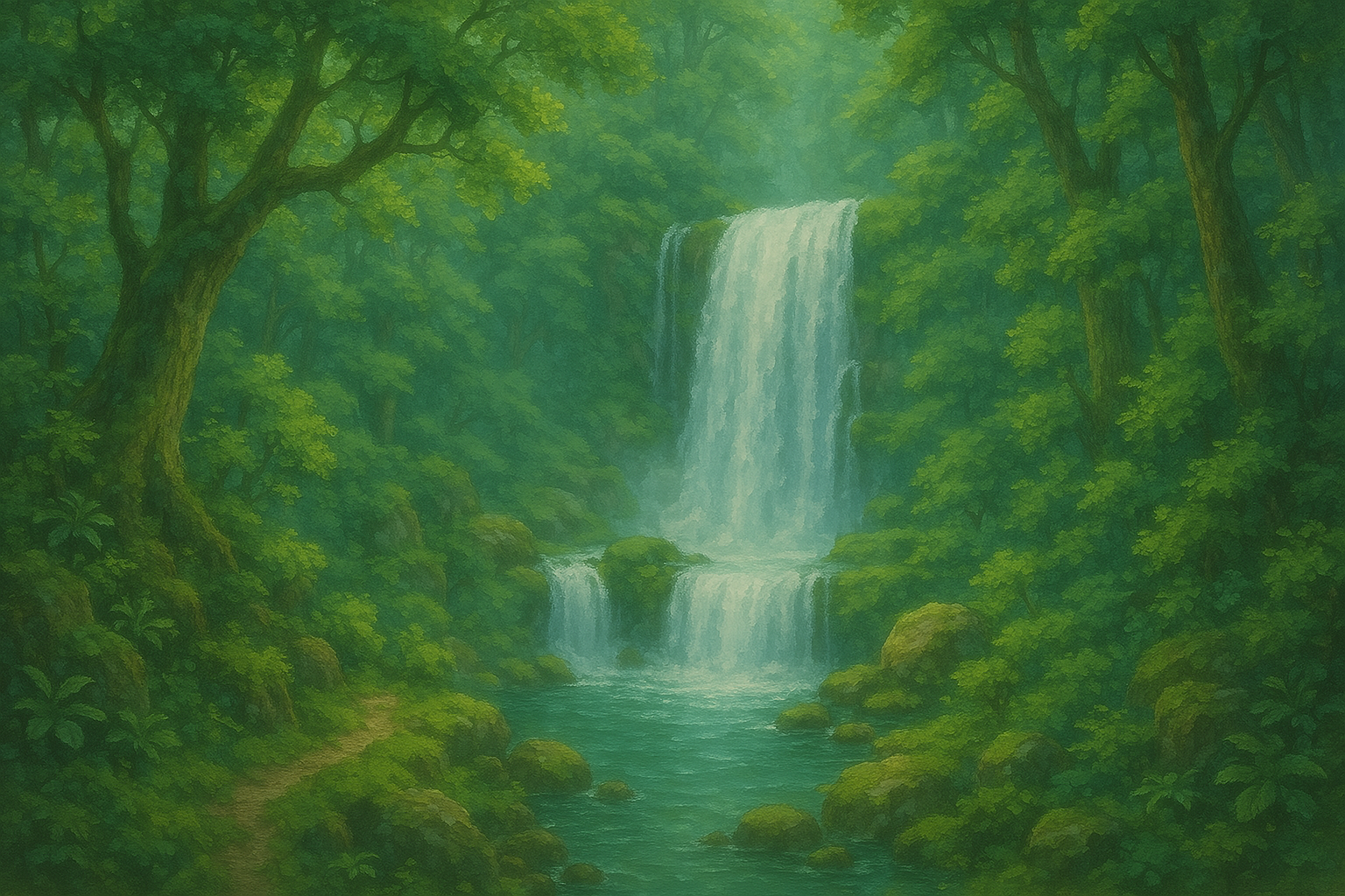 “신비로운 분위기의 지브리 스타일 숲속 폭포, 자연의 생명력이 가득한 모습”
