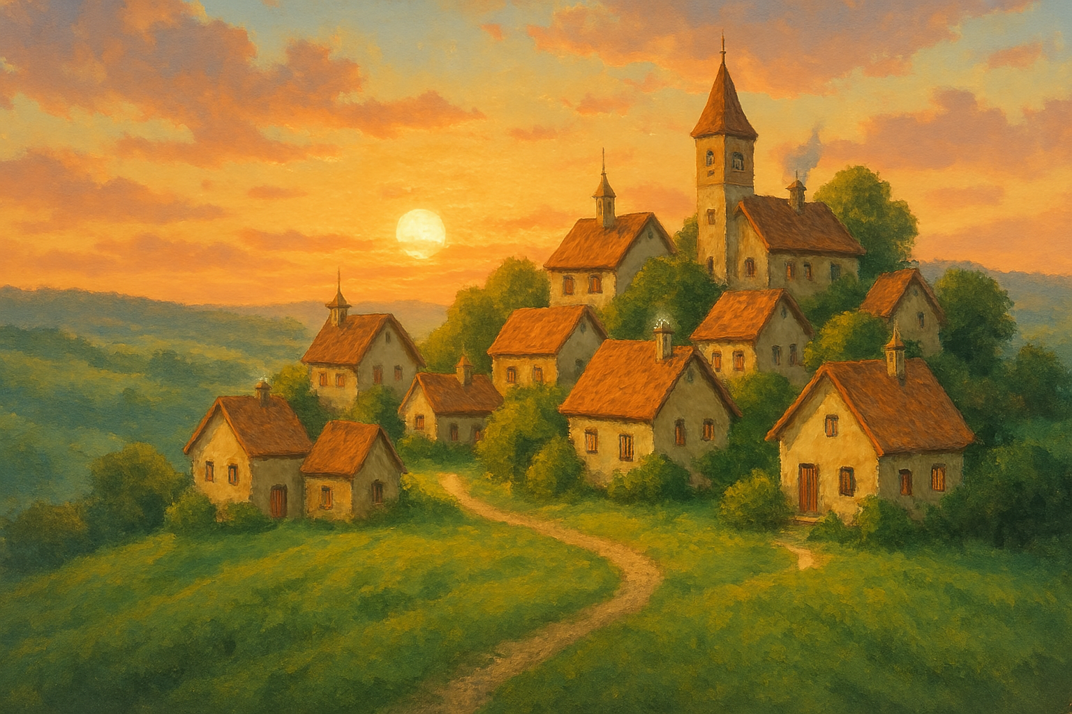 “푸른 언덕 위에 지어진 지브리 스타일의 고요한 작은 마을, 석양 아래 따뜻한 느낌으로 표현”