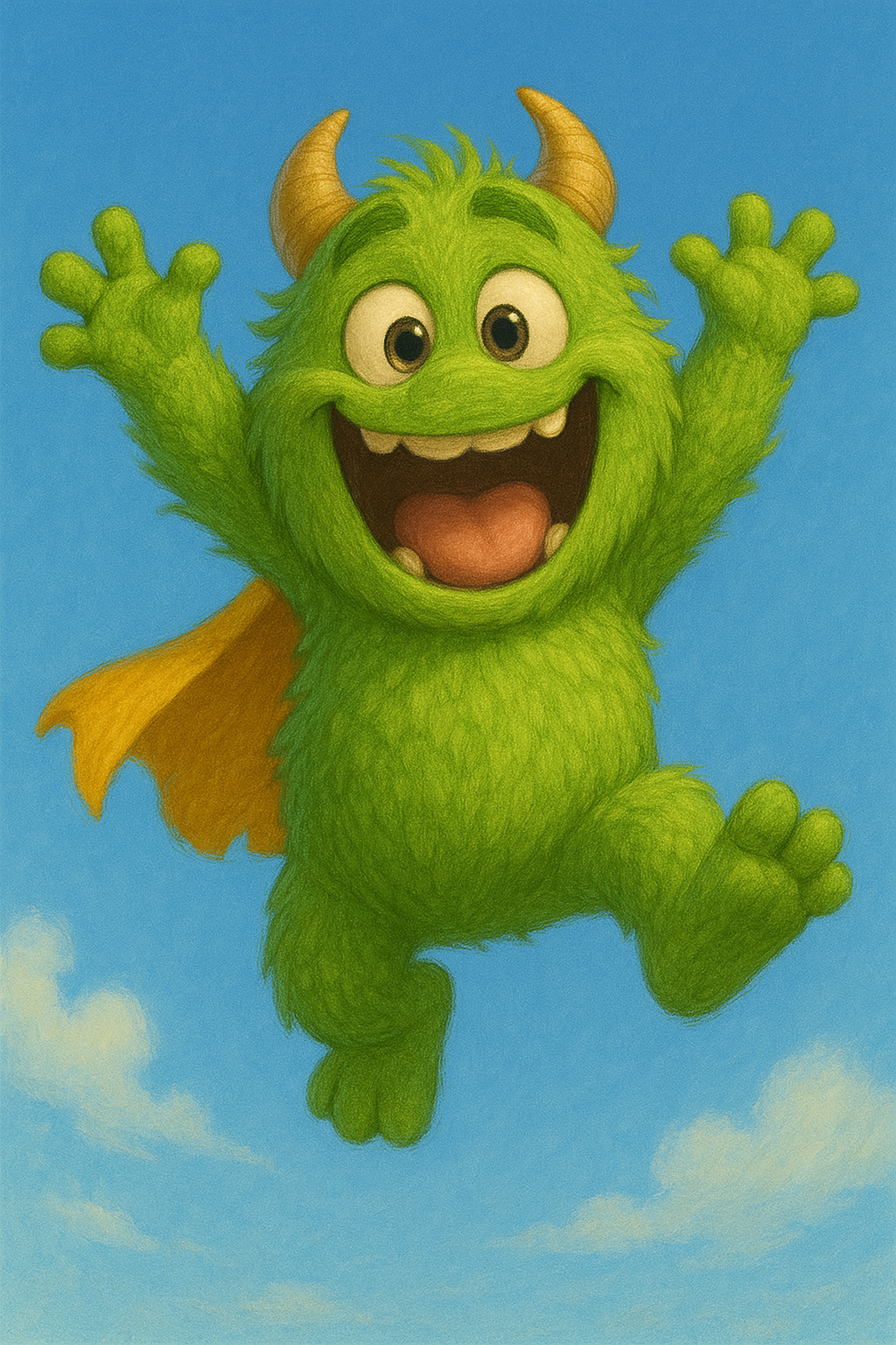 “기쁨에 찬 픽사 스타일의 작은 몬스터, 점프하는 역동적인 모습”