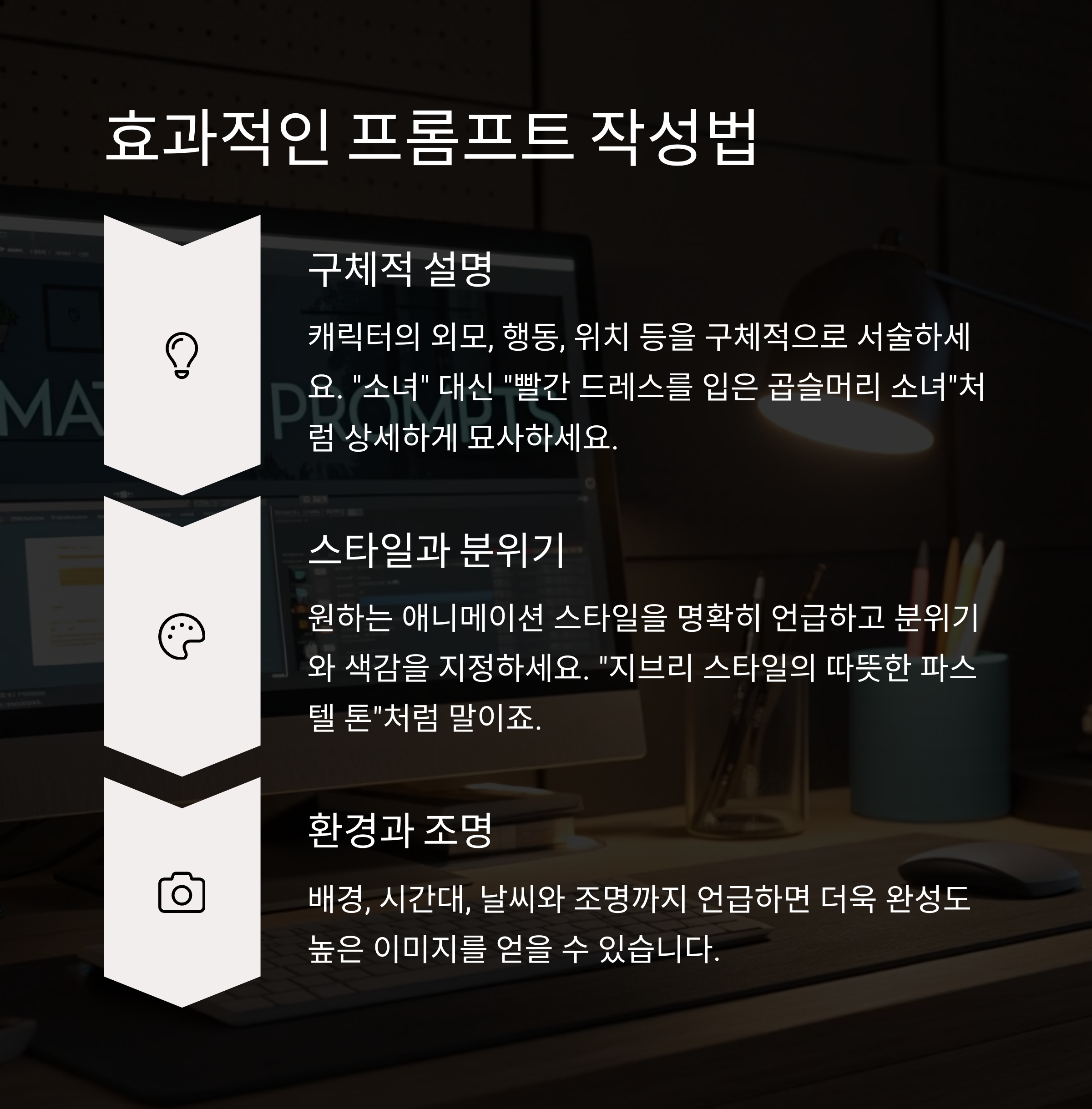 프롬프트에 스타일, 인물, 배경, 분위기를 명확히 입력하면, AI가 이를 해석해 이미지로 출력합니다.