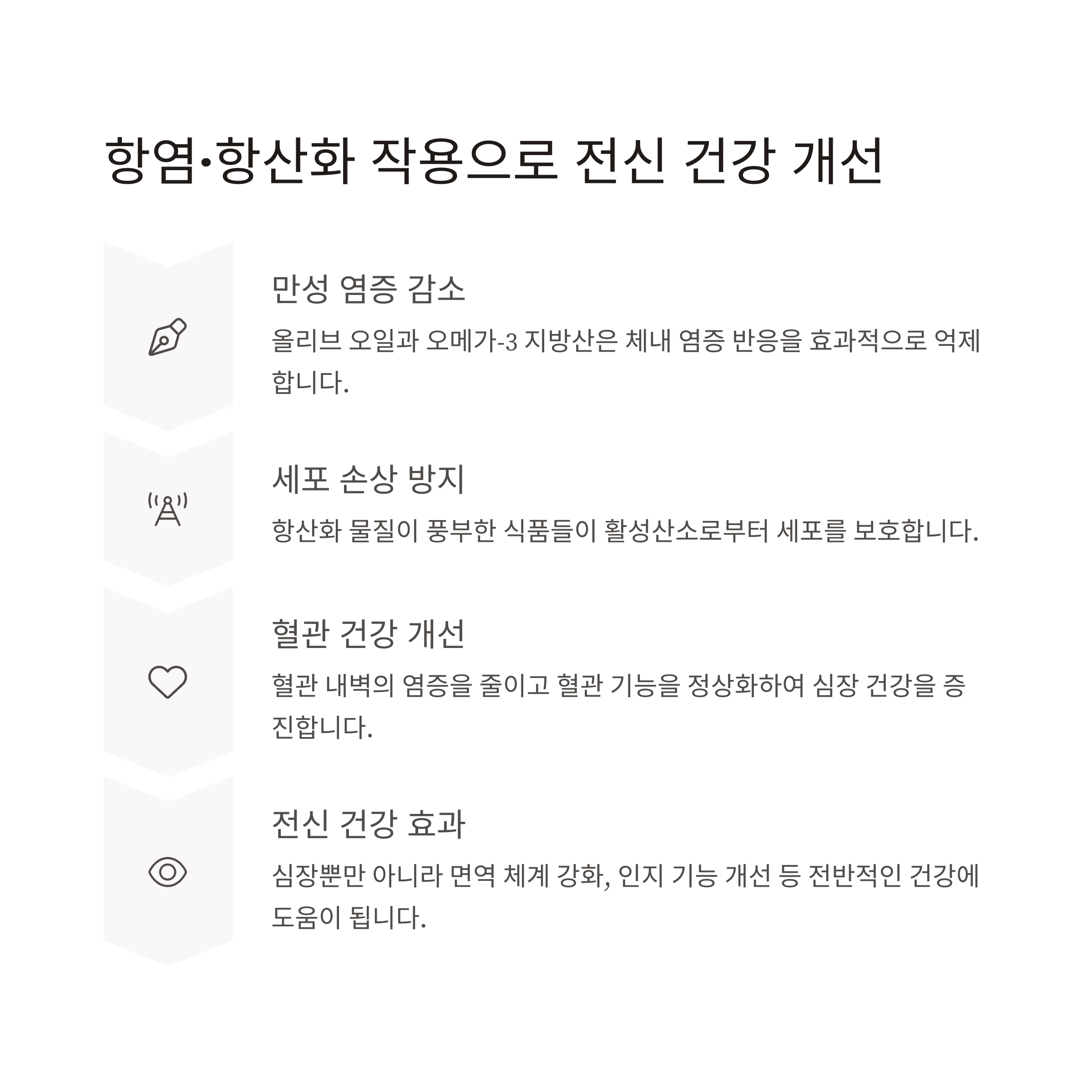 건강한 지방 위주, 항산화 식품 | 고혈압 및 콜레스테롤 개선 | 점진적 식습관 변화가 핵심 |