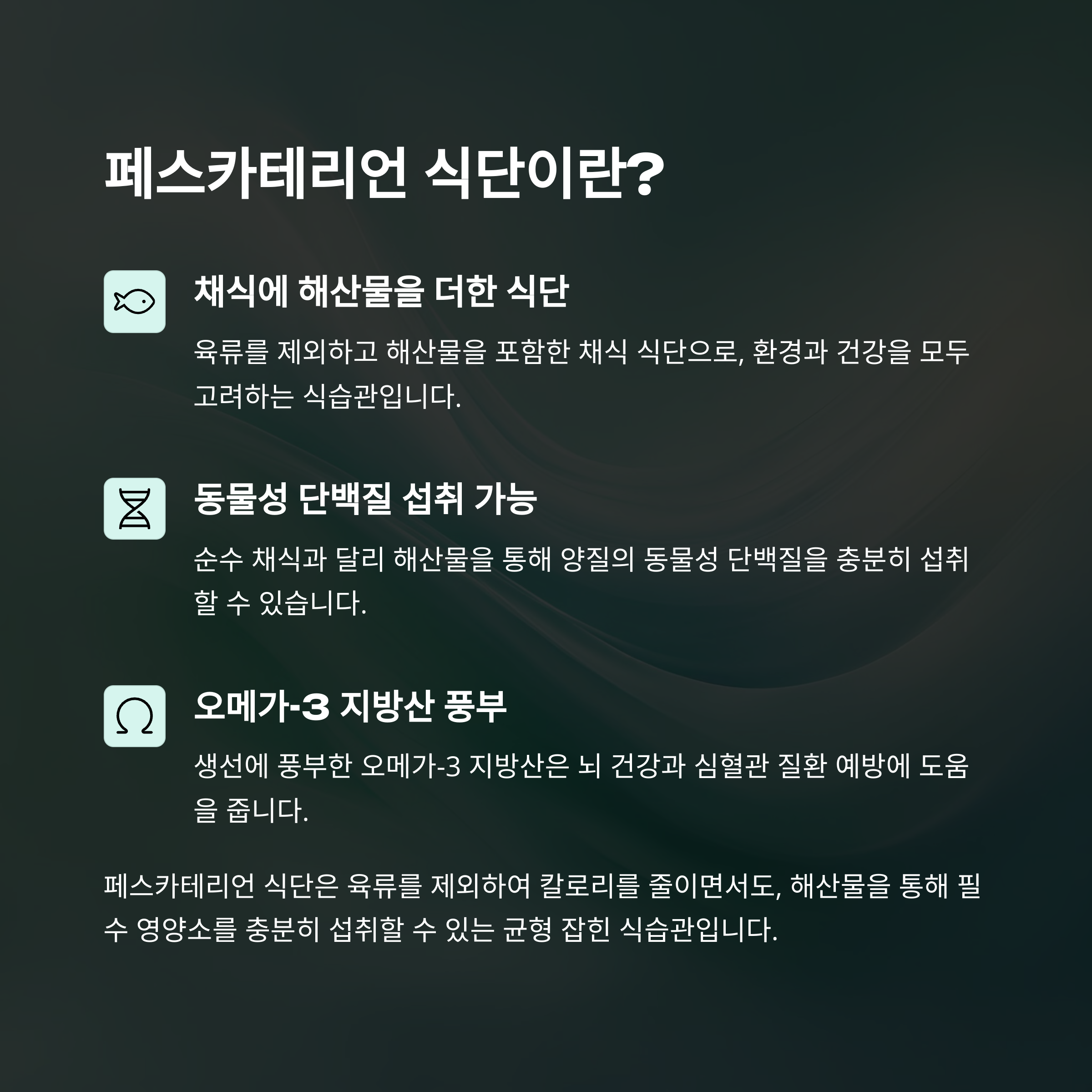 | 페스카테리언 식단이란? | 채식과 해산물을 조합한 건강 중심 식단입니다. |
