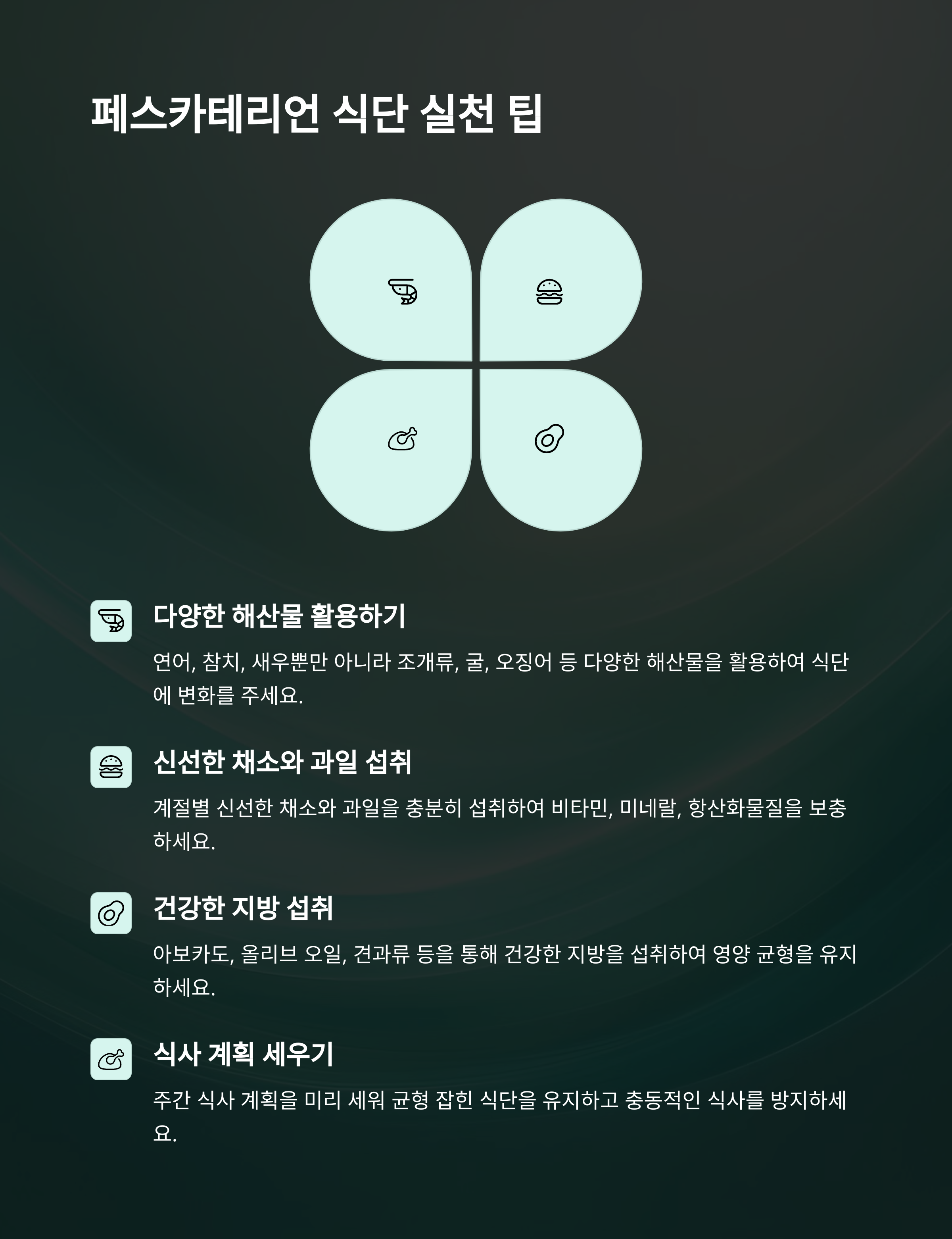 페스카테리언 식단을 성공적으로 실천하려면 식단 계획과 요리 방법에 신경 써야 합니다. 튀김보다는 굽기, 찜, 끓이기 등 건강한 조리법을 선택하고, 기름 사용을 줄이는 것도 중요합니다. 또한, 식단의 지속 가능성을 높이기 위해 계절 채소와 다양한 해산물을 활용하여 식사의 다양성을 유지하는 것이 좋습니다. 이렇게 구성된 식단은 오랫동안 실천하기 쉬우며, 체중 감량과 건강 관리 모두에 도움이 됩니다.