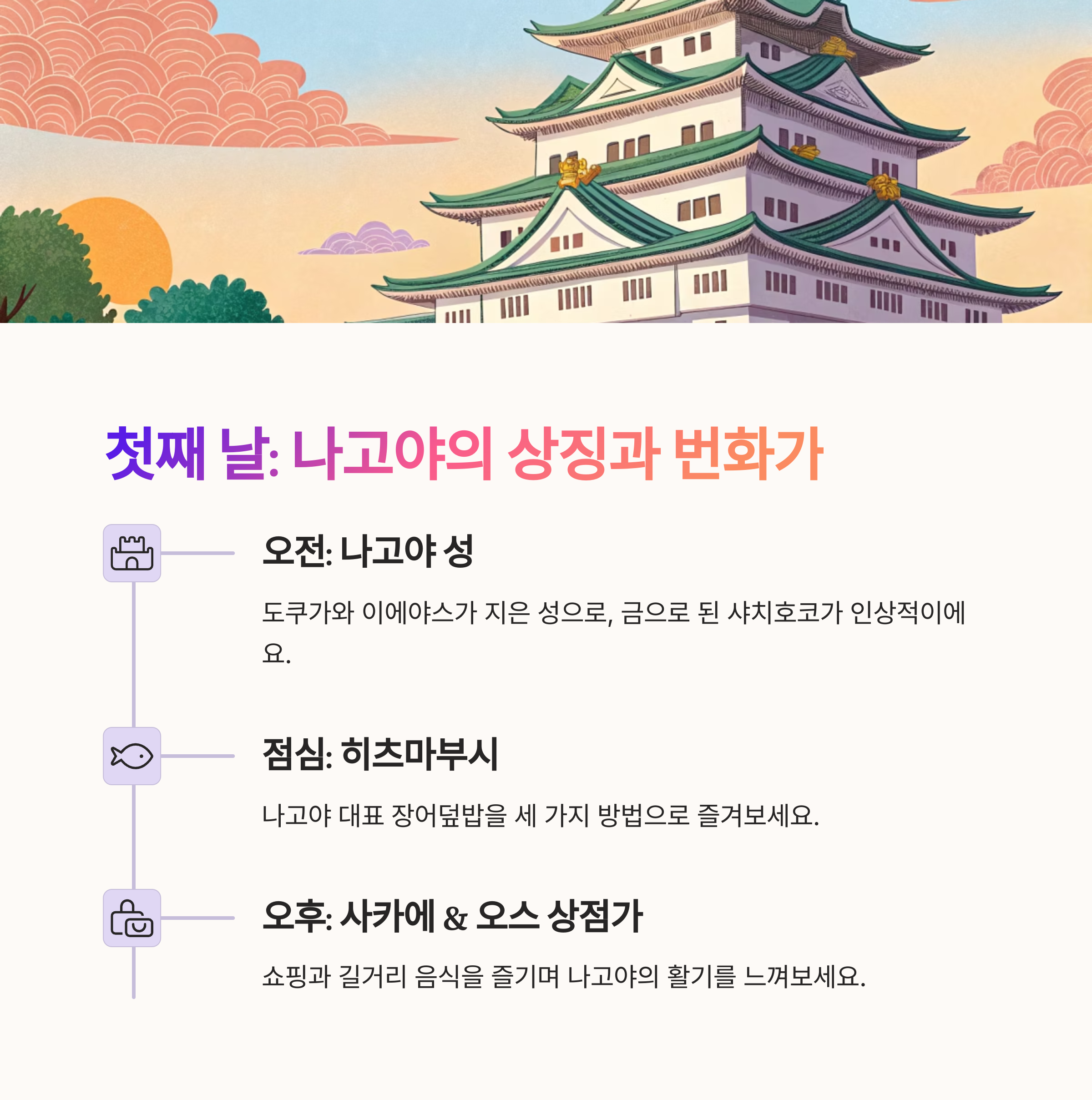 제가 직접 다녀오면서 느낀 "이건 꼭 봐야 해!", "이건 꼭 먹어야 해!" 하는 것들 위주로 알찬 2박 3일 코스를 짜봤어요. 이대로만 따라오셔도 나고야를 제대로 즐길 수 있을 거예요!