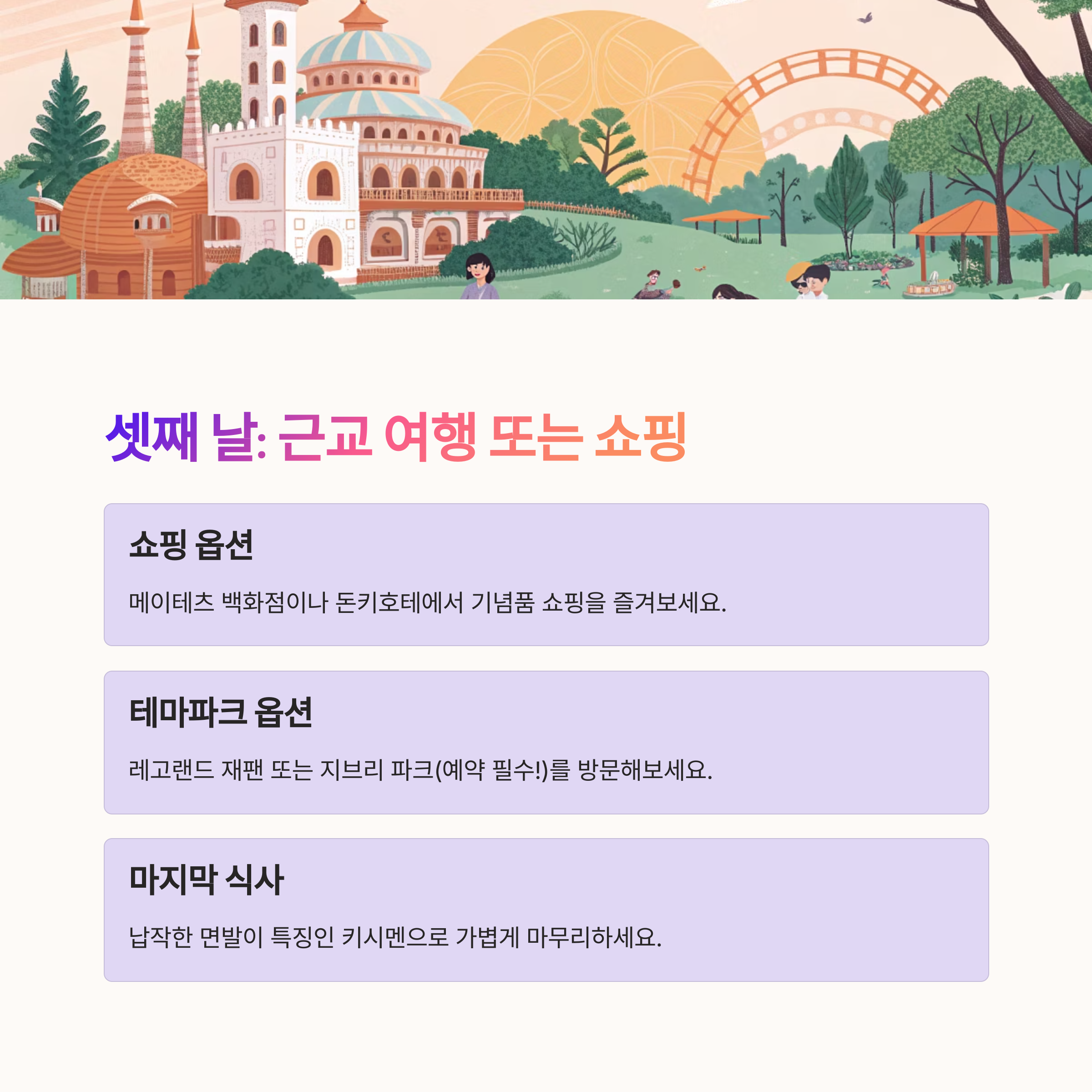 셋째 날: 근교 여행 또는 쇼핑 & 출국 준비 🚄✈️