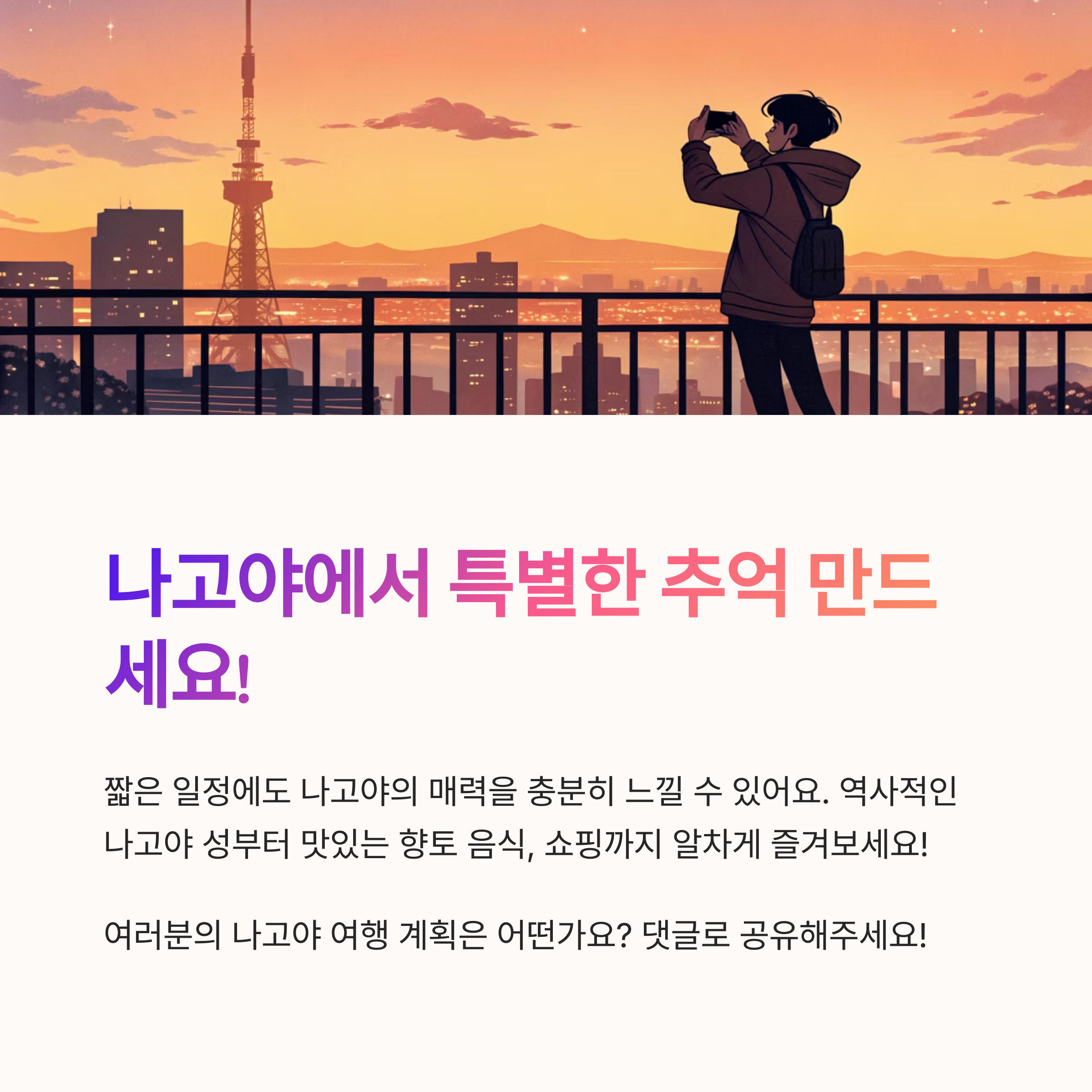자, 이렇게 나고야를 짧고 굵게 즐길 수 있는 방법을 소개해 드렸어요! 어떠셨나요? 생각보다 매력적인 도시 아닌가요? 저는 나고야에 대한 편견이 완전히 깨지는 여행이었답니다. 여러분도 이 가이드라인을 참고해서 즐거운 나고야 여행 되시길 바라요! 더 궁금한 점이 있다면 언제든지 댓글로 물어봐주세요~ 😊