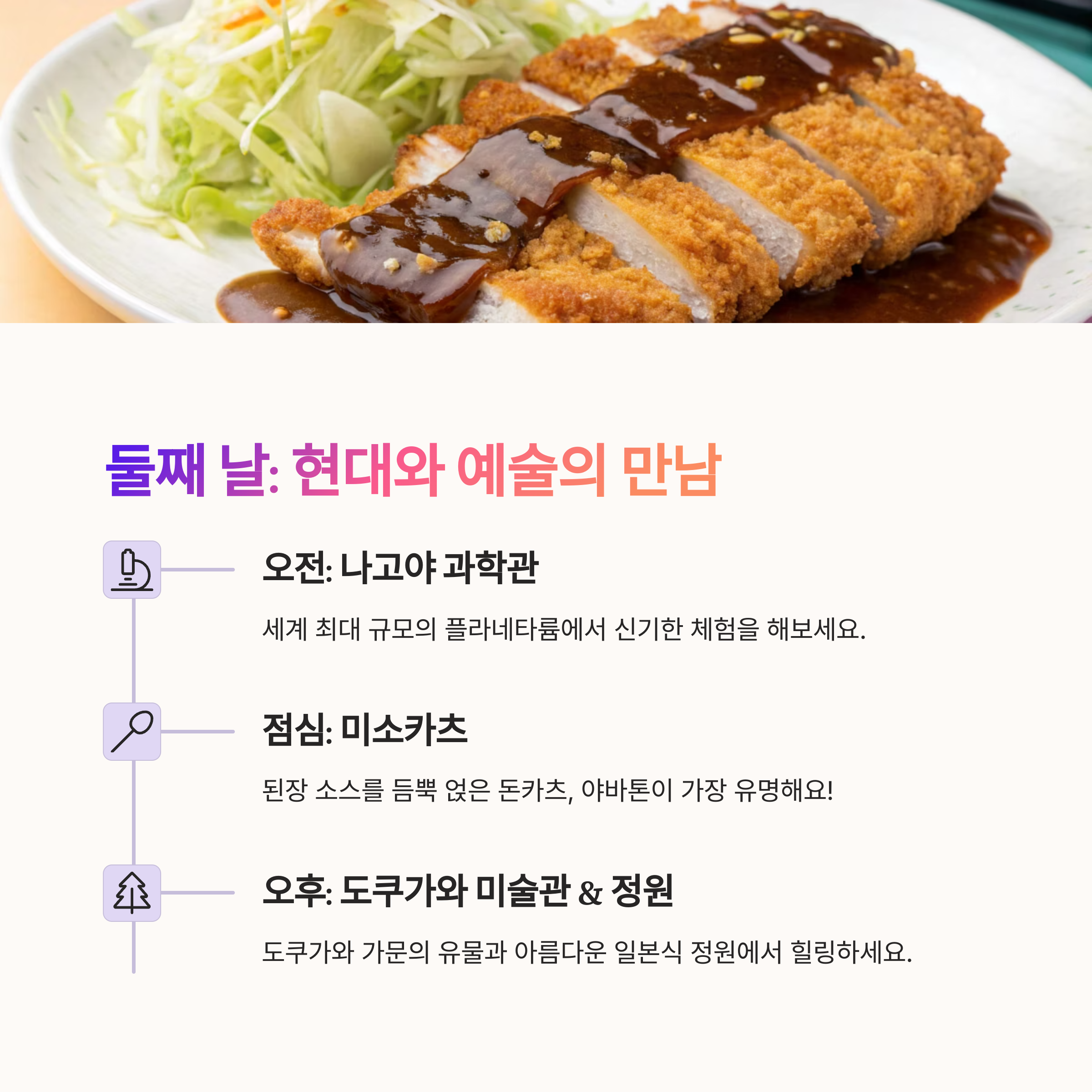 - 오감만족 미식 경험: 히츠마부시, 미소카츠, 테바사키는 필수 코스! 현지인 맛집 찾아가는 재미도 놓치지 마세요.