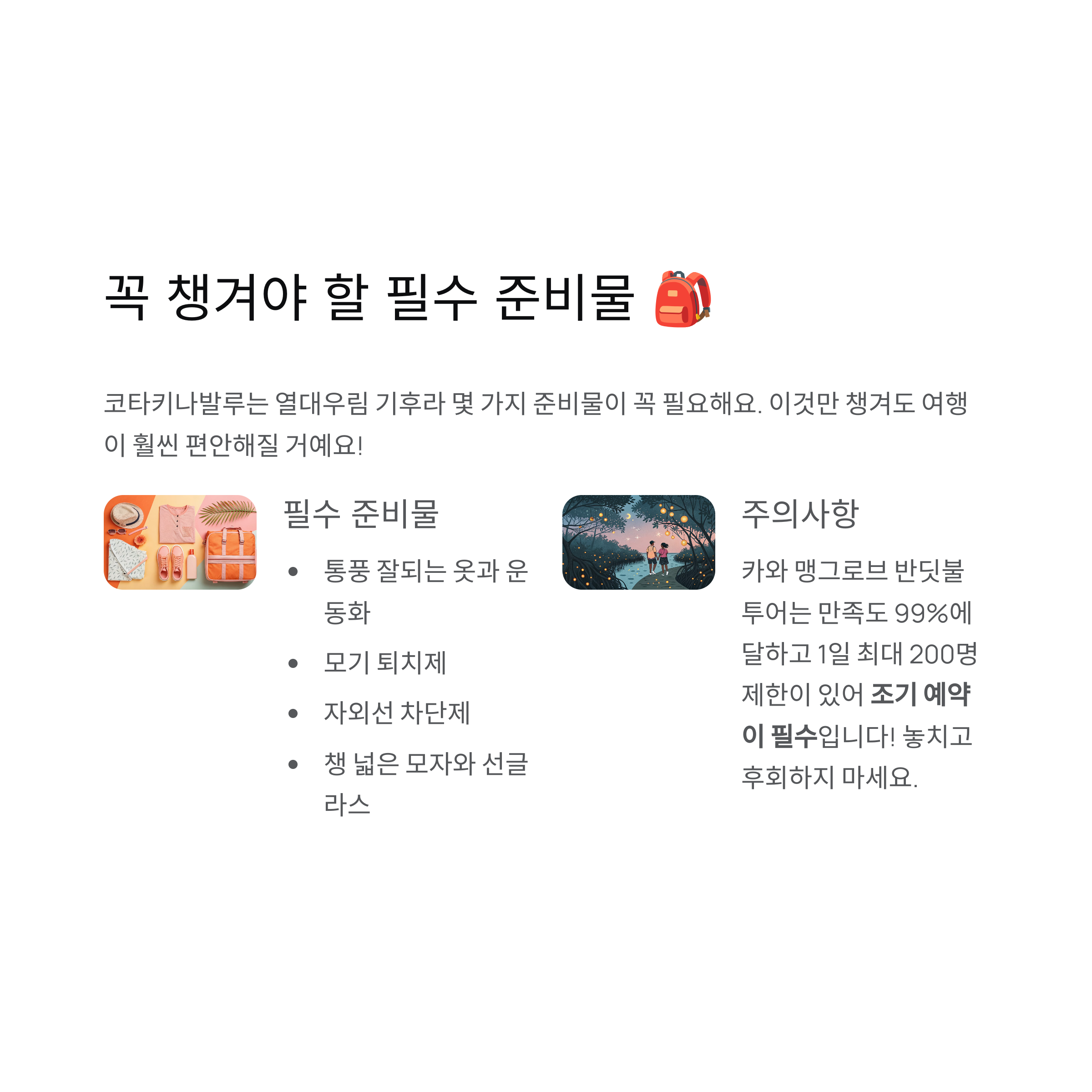 - ⚠️ 핵심 유의: 반딧불 투어 등 인기 투어는 조기 예약 필수!