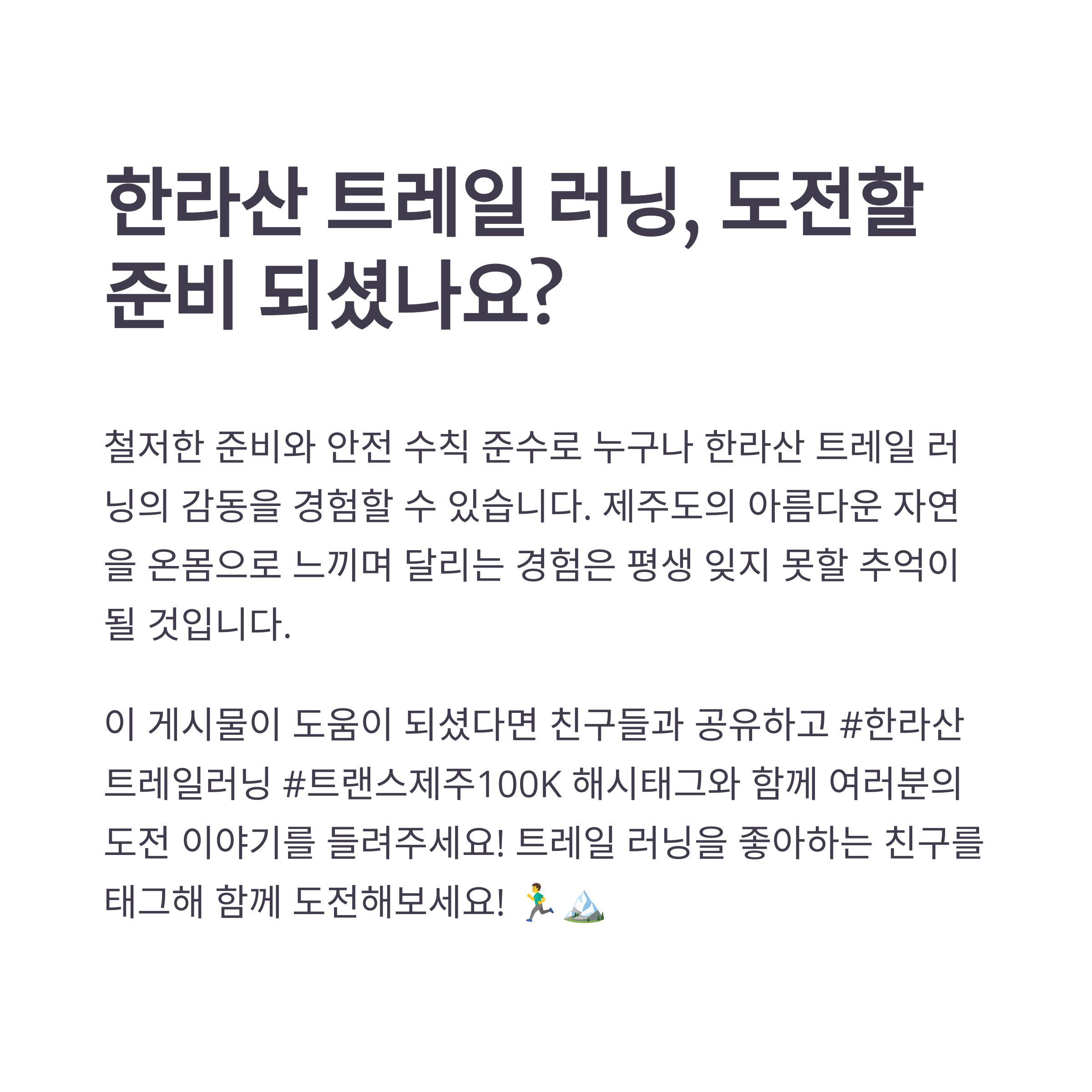 특히 한라산의 아름다움을 체험하며 러닝을 즐기며 스스로를 시험하고 성장하는 계기로 삼으세요.
