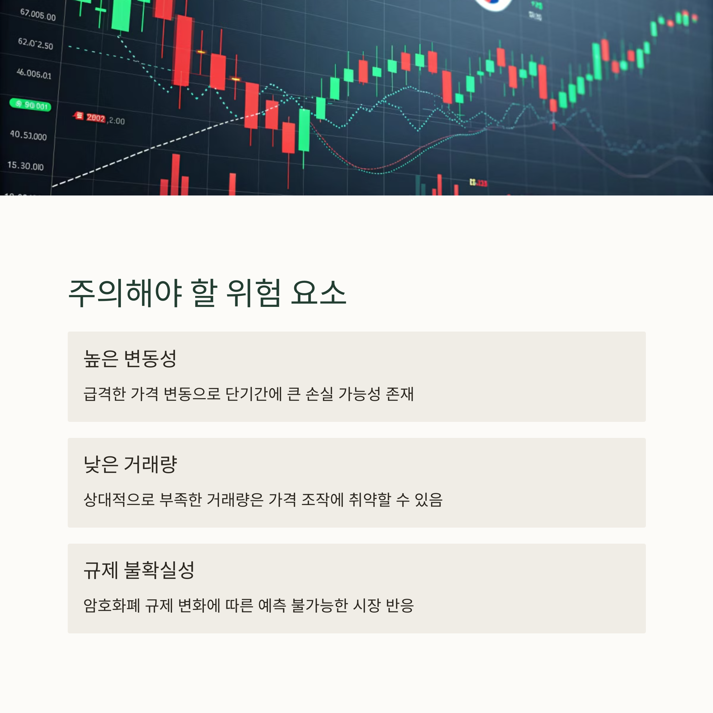 | 시세 흐름 분석이 핵심 | 투자 판단 시 과도한 기대는 금물 | 리스크 관리 필수 요소로 강조 |
