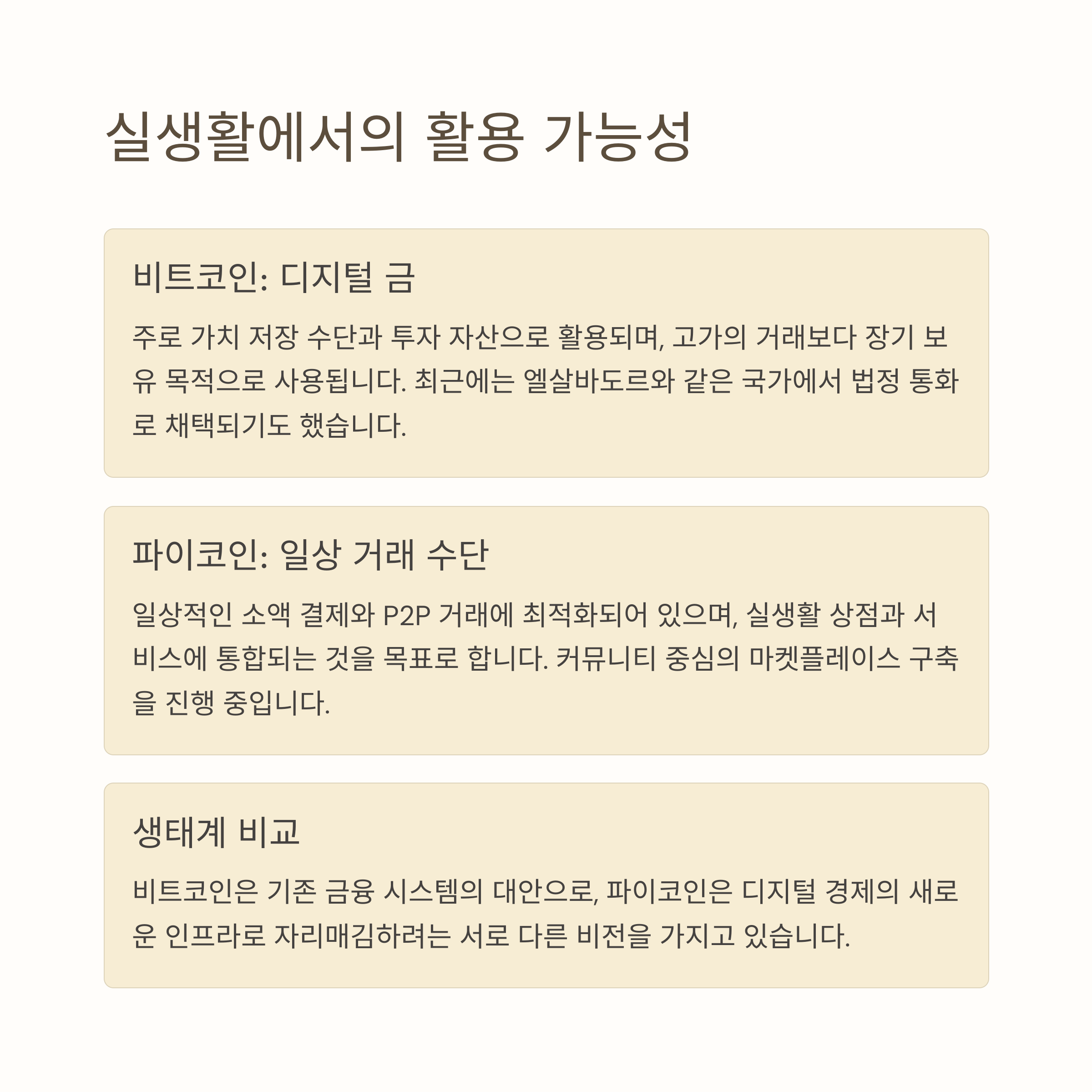 기술적 특성에서도 두 암호화폐는 상이합니다. 비트코인은 제한된 총 공급량을 기반으로 가치 보존 특성을 갖추고 있으며, 강력한 보안성을 자랑합니다. 반면 파이코인은 아직 공급량에 대한 명확한 기준은 없지만, 지속적인 거버넌스 논의와 보안 개선을 통해 실사용 기반을 넓히고 있습니다. 또한 커뮤니티 중심 생태계가 활성화되어 있어 장기적인 가치 상승 가능성을 내포하고 있습니다.