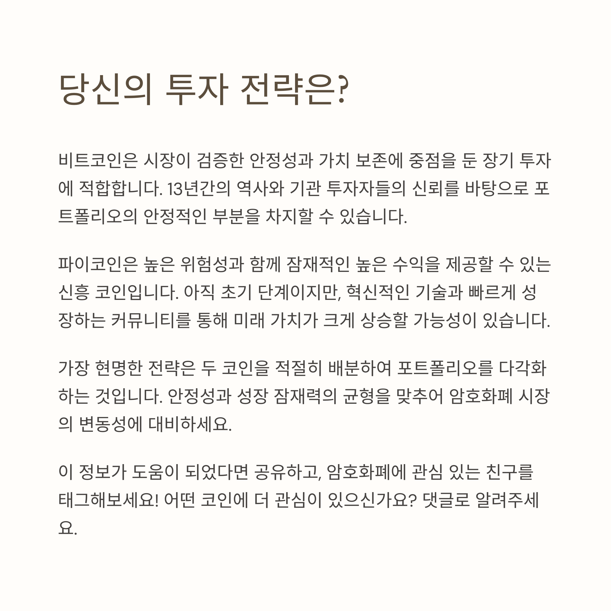 파이코인과 비트코인은 각각의 독창적인 특성과 기술력을 통해 암호화폐 시장에서 중요한 역할을 수행하고 있습니다. 전통적인 가치 저장 수단으로서의 비트코인과, 접근성과 커뮤니티 기반 생태계로 성장하는 파이코인은 서로 다른 방향에서 시장을 형성해 나가고 있습니다. 투자를 고려하는 분들이라면 각 코인의 기술적 기반과 활용 가능성을 충분히 검토하고 접근하는 것이 바람직합니다.