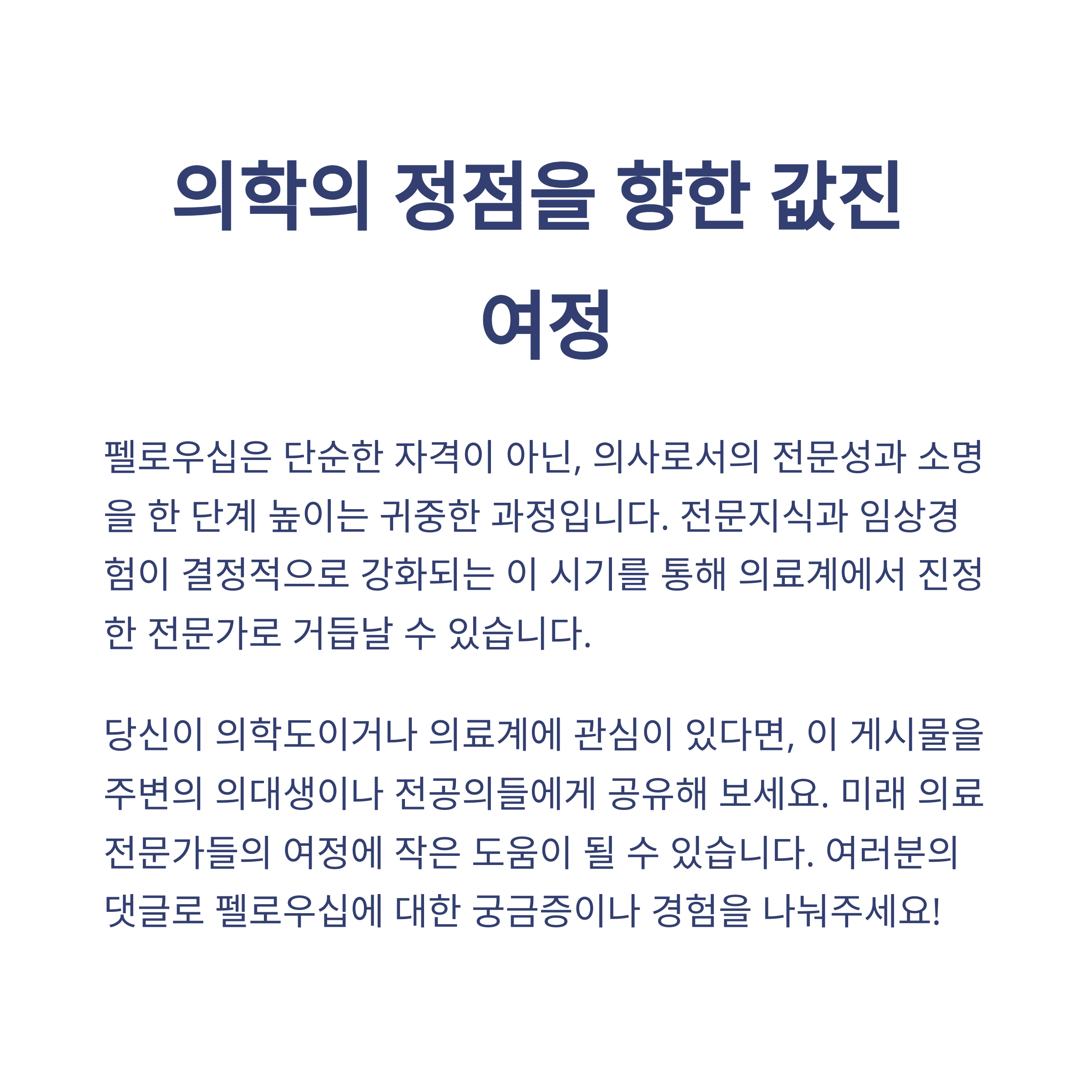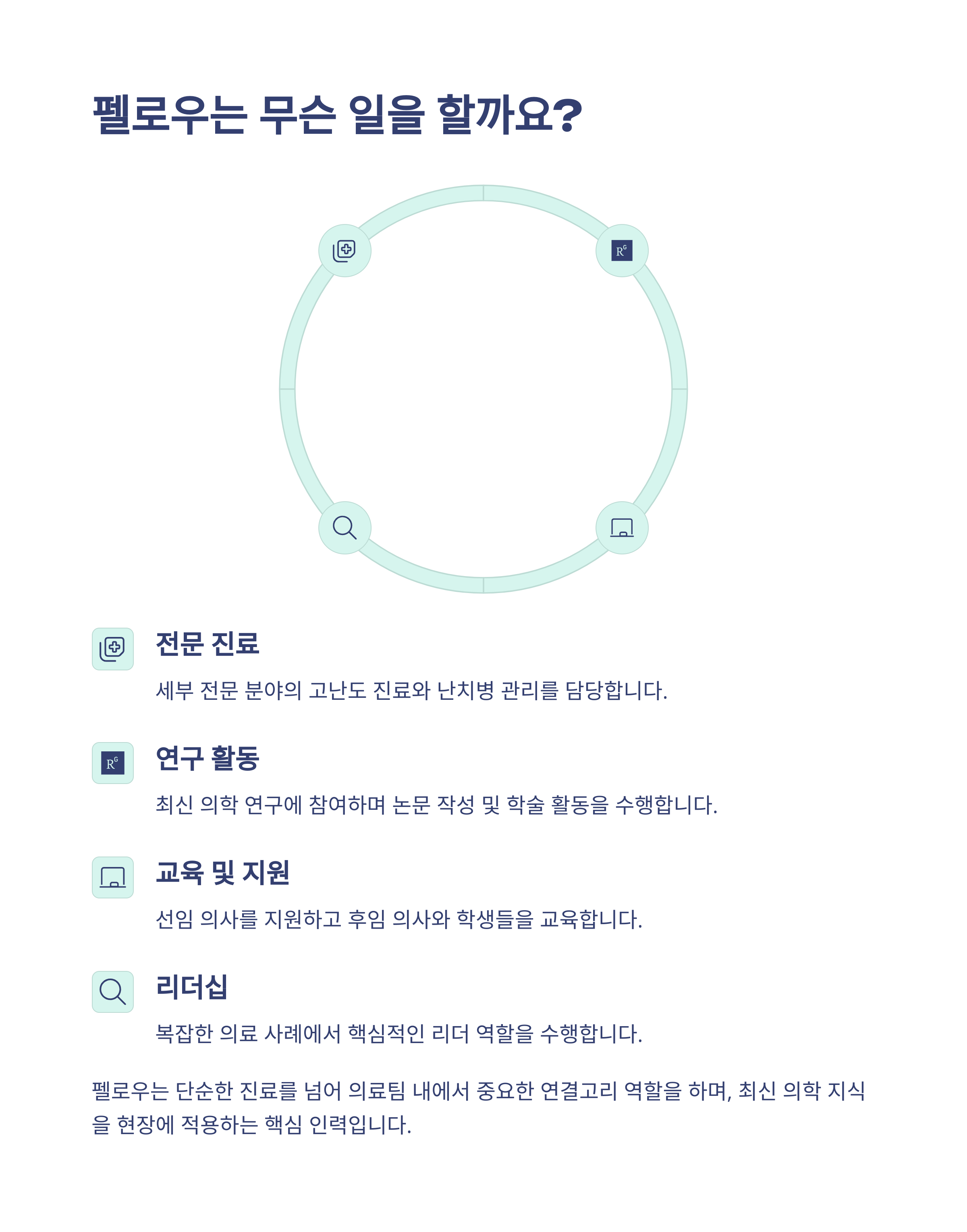 | 펠로우란? | 특정 세부 분야에서 전문성을 추가로 쌓는 의사 |